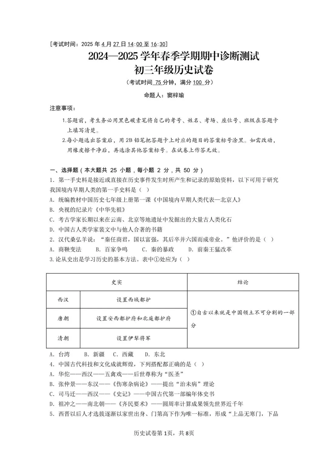 >民大附中2025年4月期中考试历史试卷