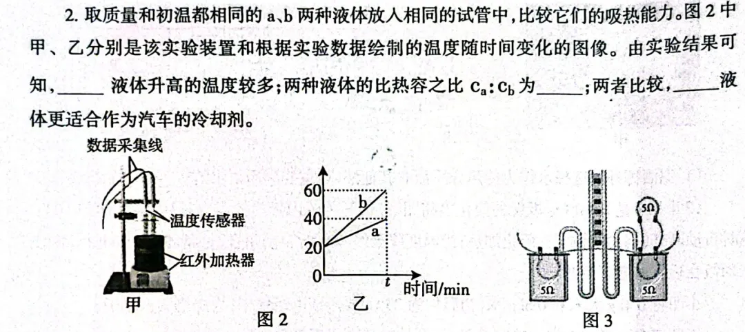 第二空计算比热容之比时,容易弄反比例关系。注意:在吸收热量和质量相同时,比热容与温度变化量成反比。