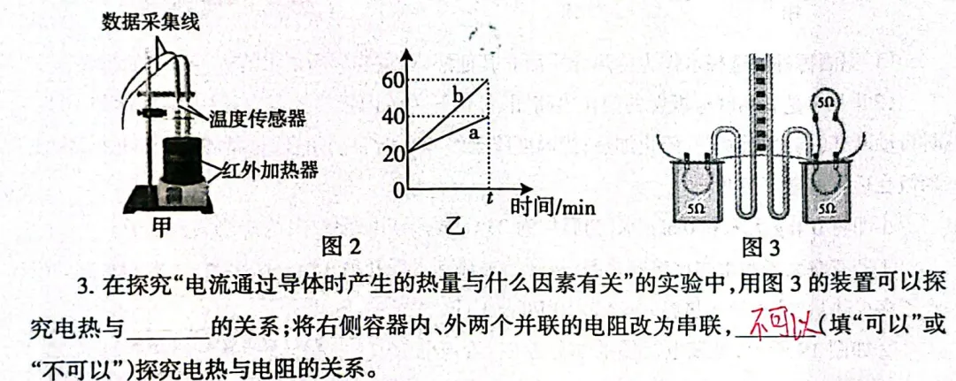 第二空需要理解电路连接方式的改变如何影响电流关系。改串联后,要确保通过两个容器内电阻的电流相等,这样才能控制变量。题目未明确外侧电阻的具体连接方式,但根据实验设计的一般思路,改为串联可以实现电流相同,因此“可以”。
