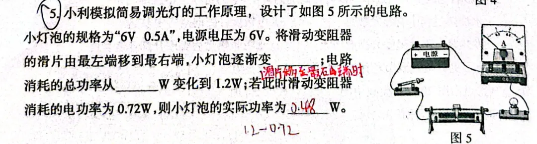第一空容易搞反方向。注意“由最左端移到最右端”的过程中,滑片移动方向与阻值变化的关系。通常最左端对应阻值最小,最右端对应阻值最大,电流逐渐减小,灯泡逐渐变暗。