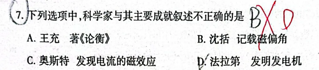 A. 王充 著《论衡》王充是东汉时期的思想家,著有《论衡》一书,书中涉及一些朴素的物理思想(如对声音传播、雷电等的思考)。此项叙述正确。