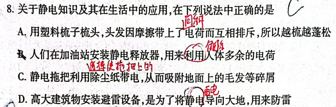 D. 高大建筑物安装避雷设备,是为了将静电导向大地,用来防雷避雷针的作用是将雷电(云层与地面之间的强电流)引入大地,保护建筑物。虽然雷电本质上是静电积累后放电,但在初中物理中,避雷针防的是“雷击”,日常所说的“静电”通常指摩擦起电等弱电现象。此项表述容易造成概念混淆,不够准确。