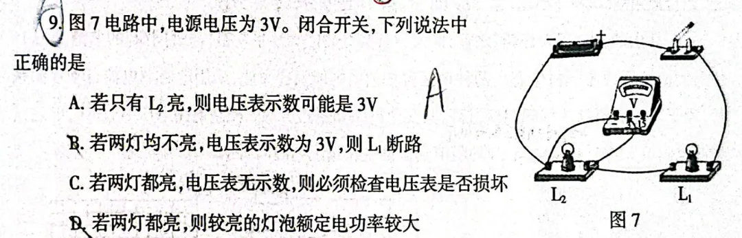 A:如果只有L2亮,说明L1被短路而非断路,所以电压表示数即为电源电压3V