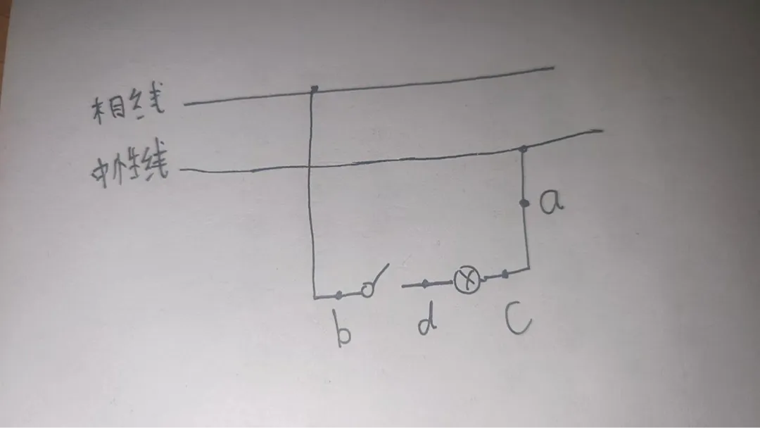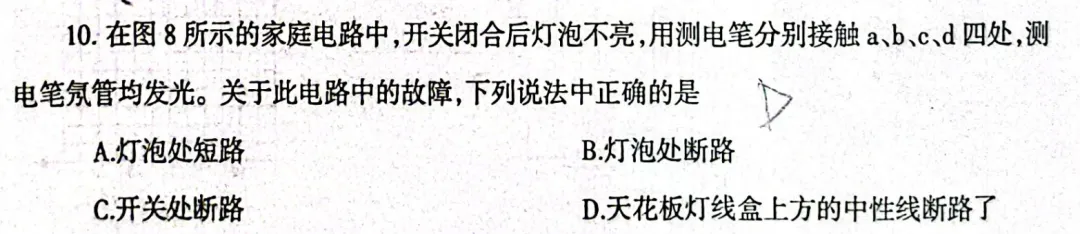 同理,若开关断路,则a、c、d三点均无电压,测电笔不会发光,故C项错误。