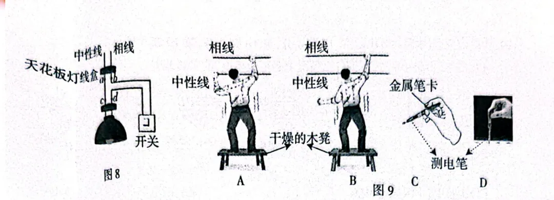 若天花板线盒上方的中性线断路,则a、b、c、d四点仍能正常点亮测电笔,故D项正确。