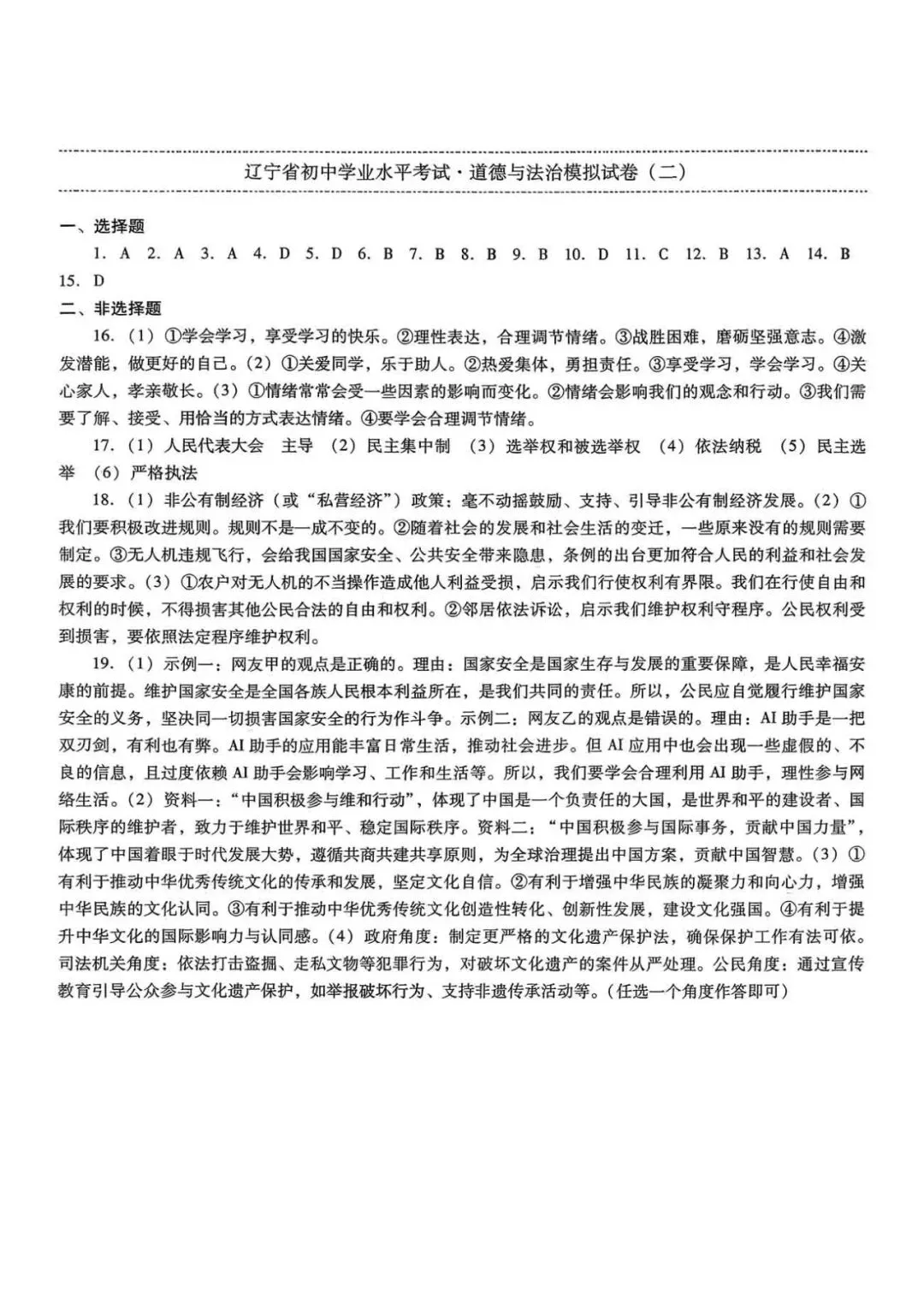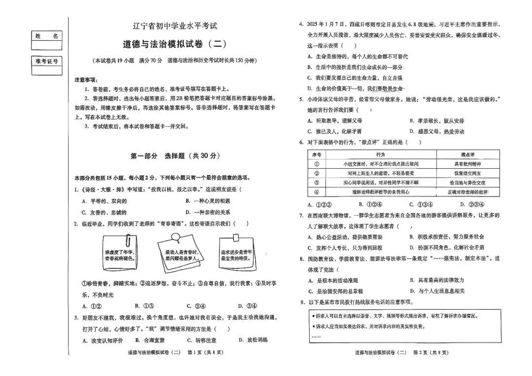 >辽宁省中考道法模拟试卷(二)——中考最后一套卷2026年(辽宁专版)