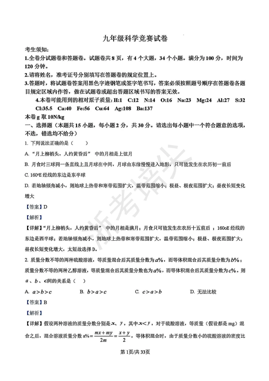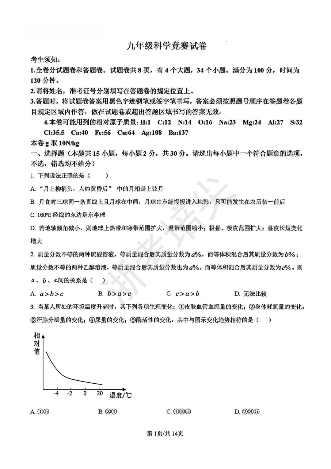 竞赛|浙江省九年级科学竞赛试卷(含答案解析)