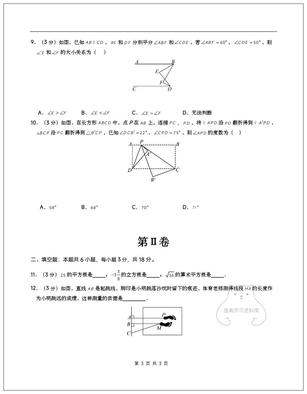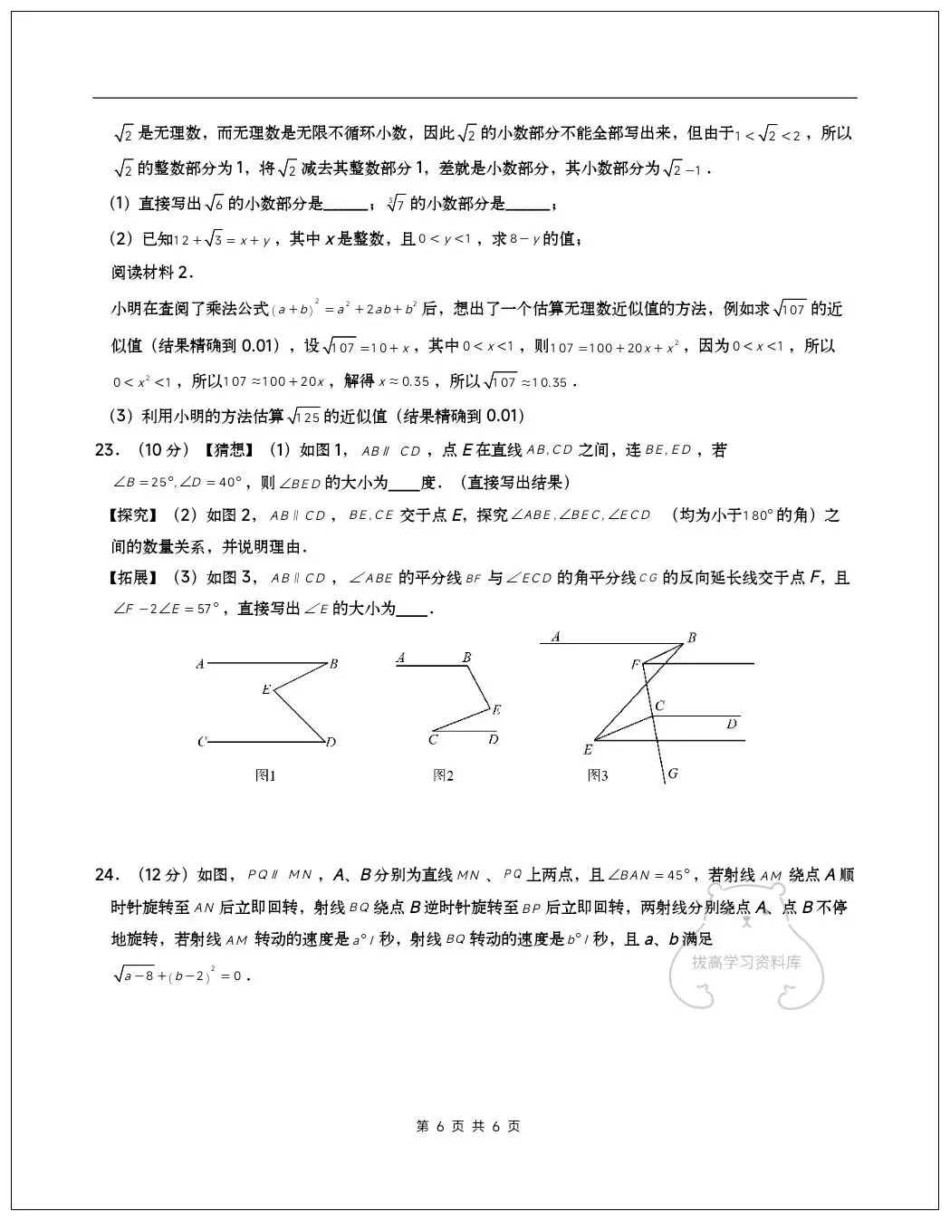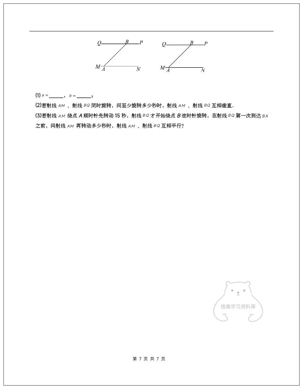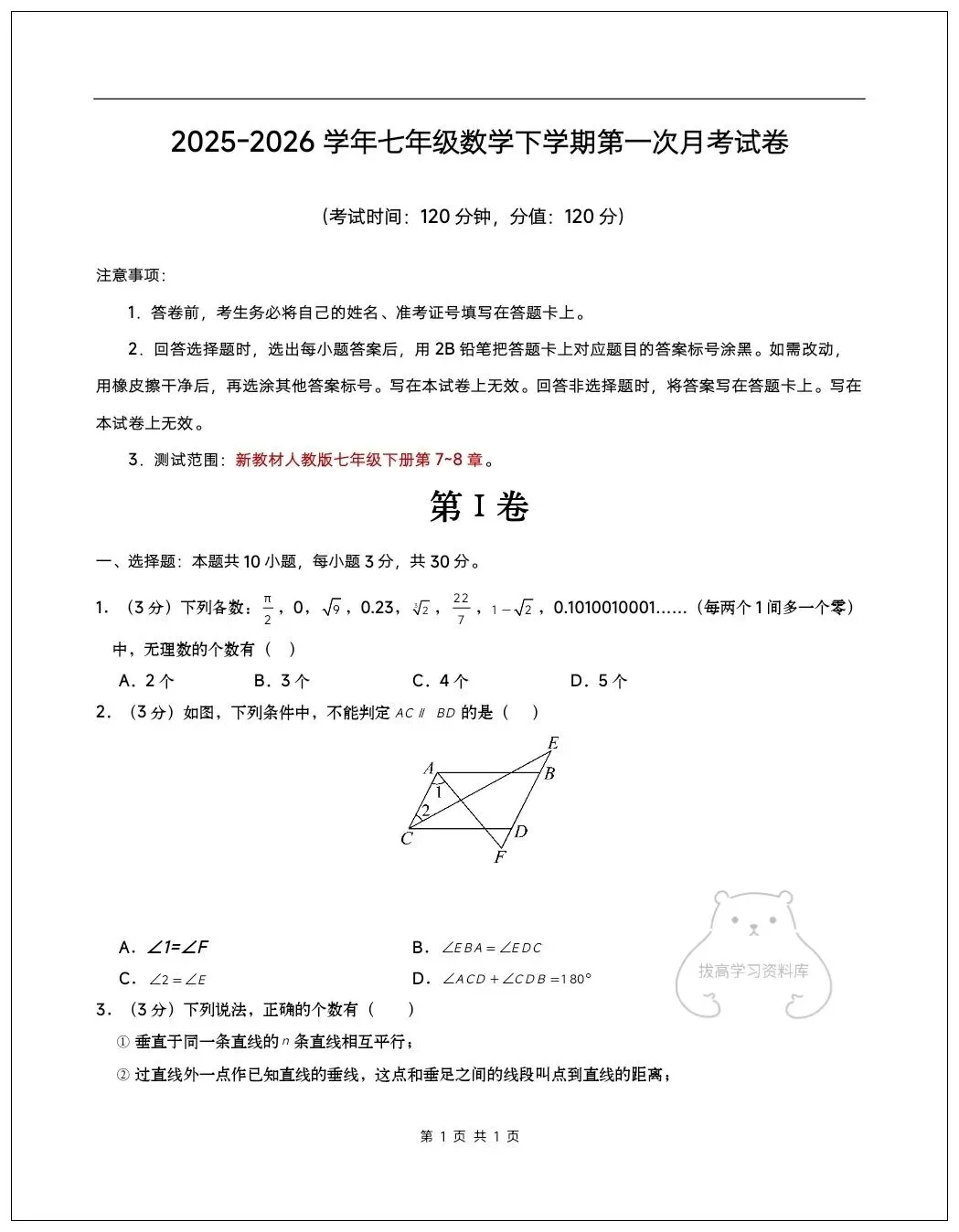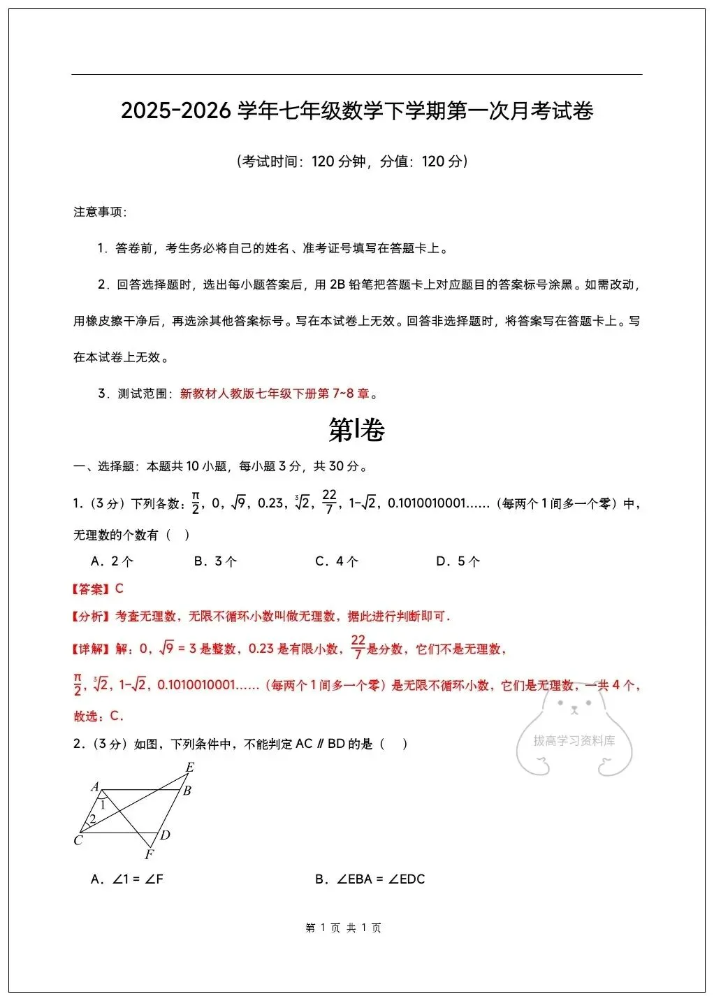 2026七年级数学下学期第一次月考试卷(含答案)共10套可打印!
