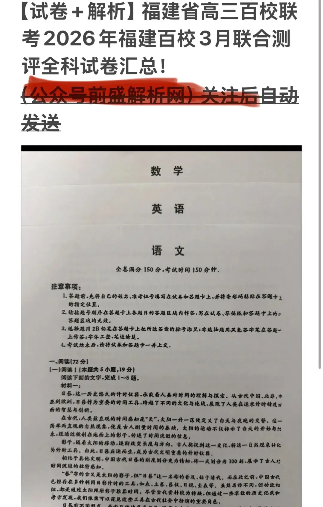 >注意【试卷+解析】福建省高三百校联考2026年福建百校3月联合测评全科汇总!