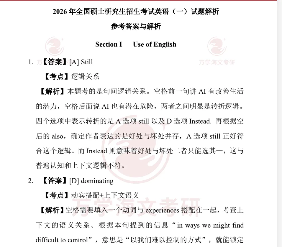 >1998-2026年考研英语一真题及答案分享