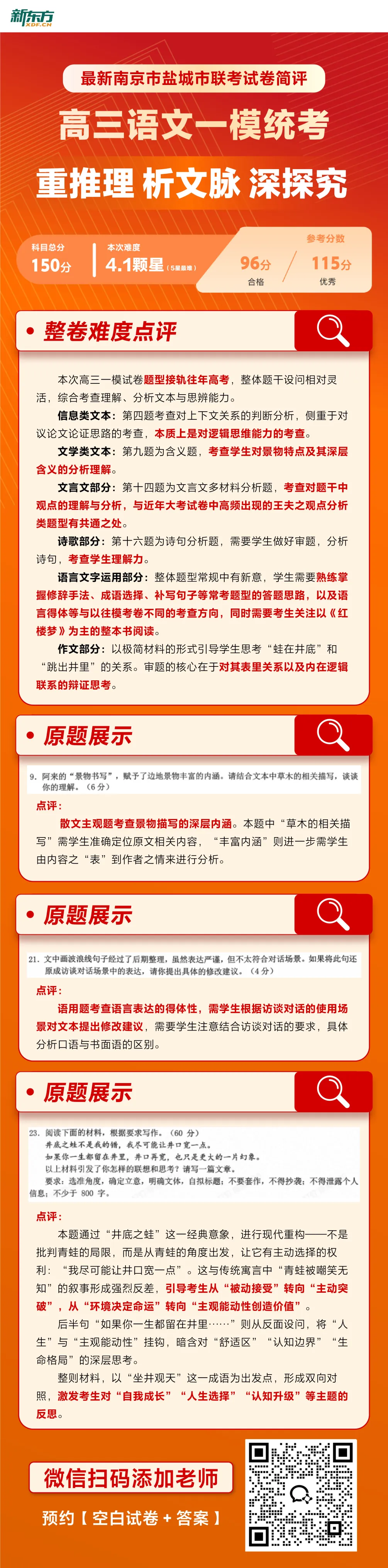 本次高三一模试卷题型接轨往年高考,整体题干设问相对灵活,综合考查理解、分析文本与思辨能力。