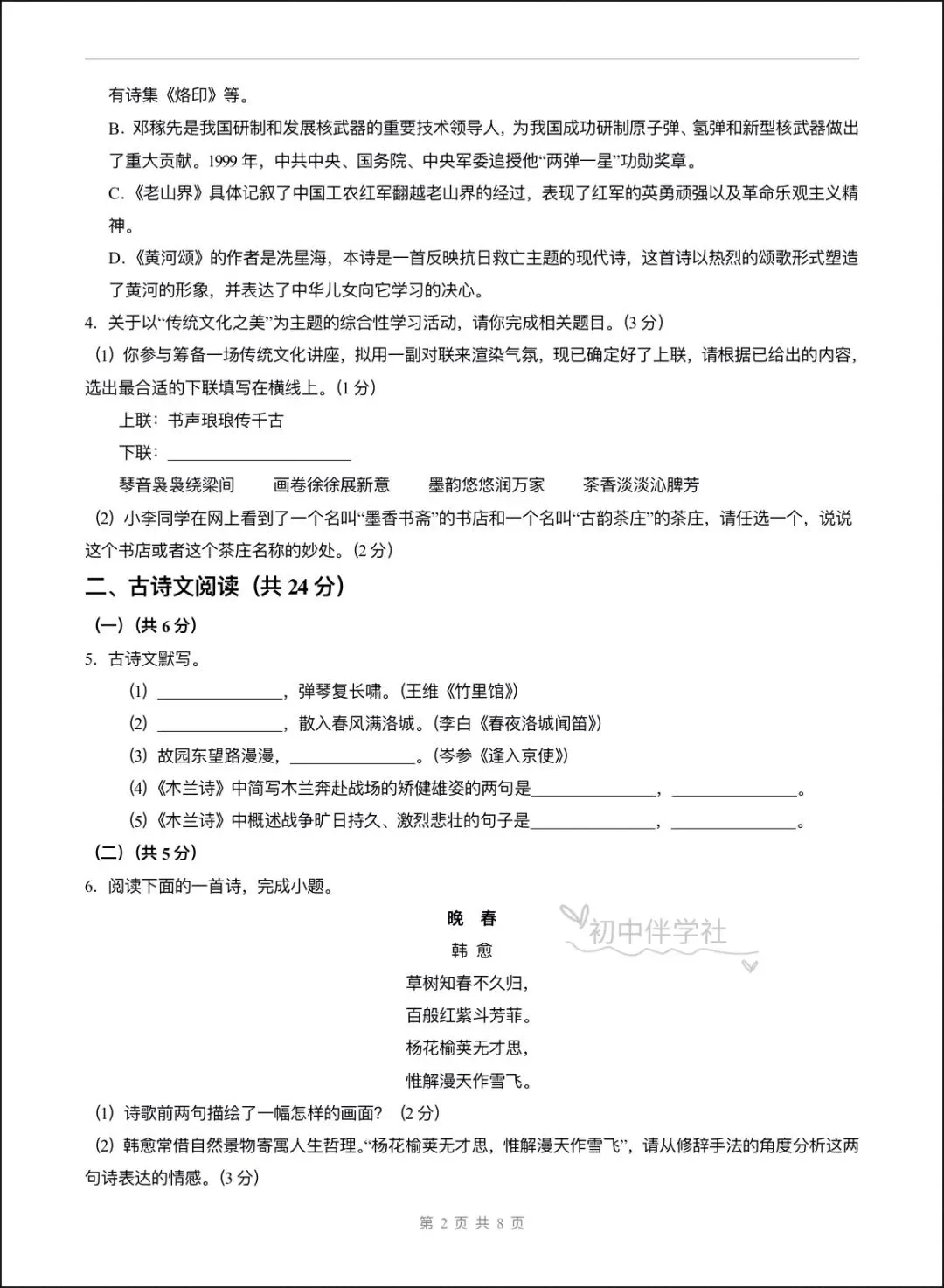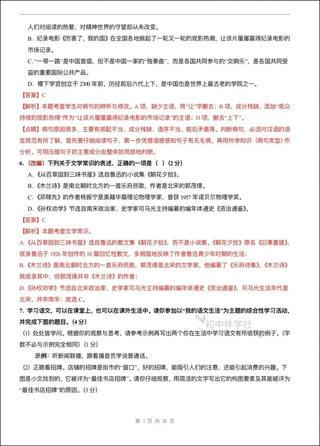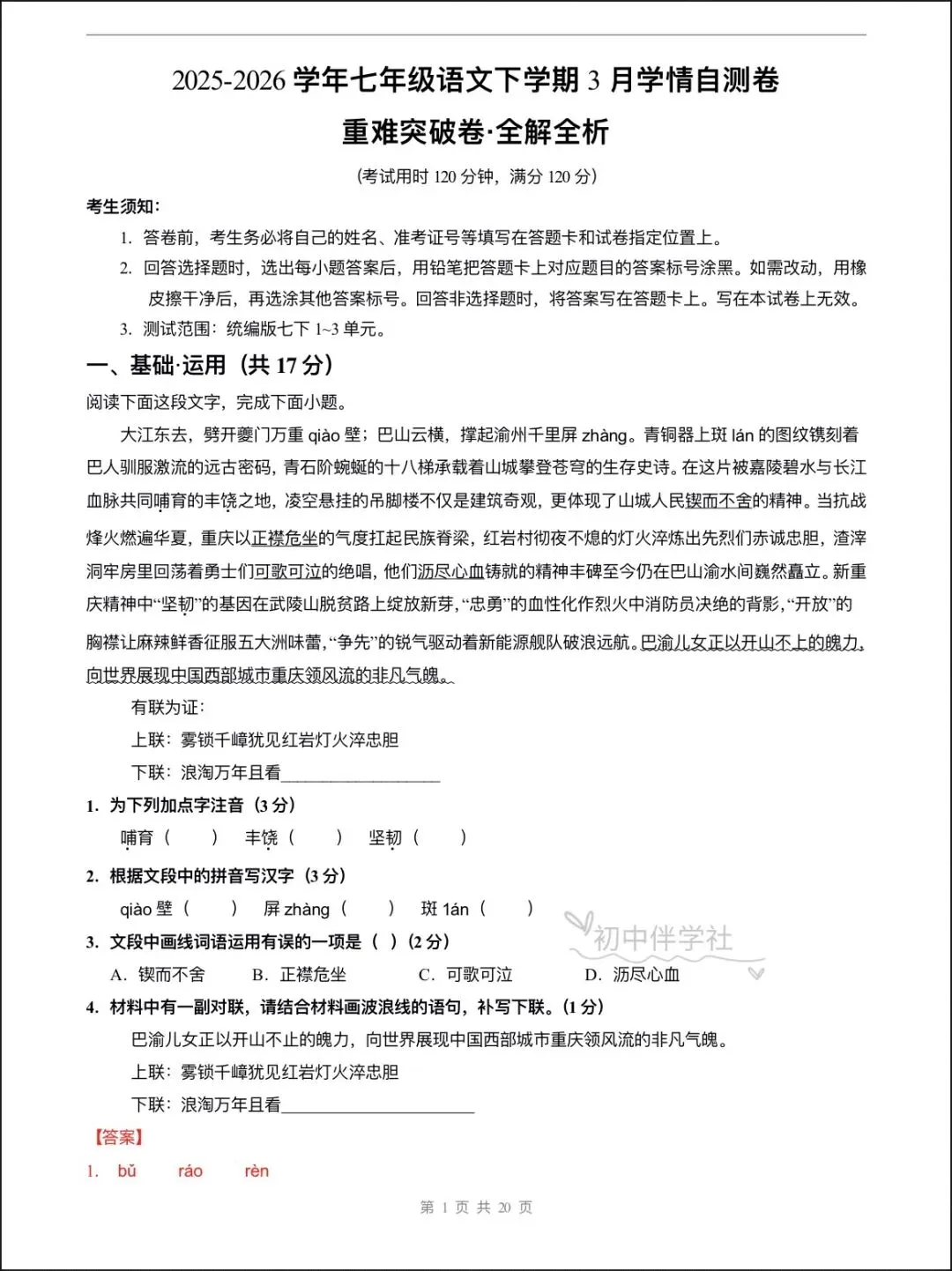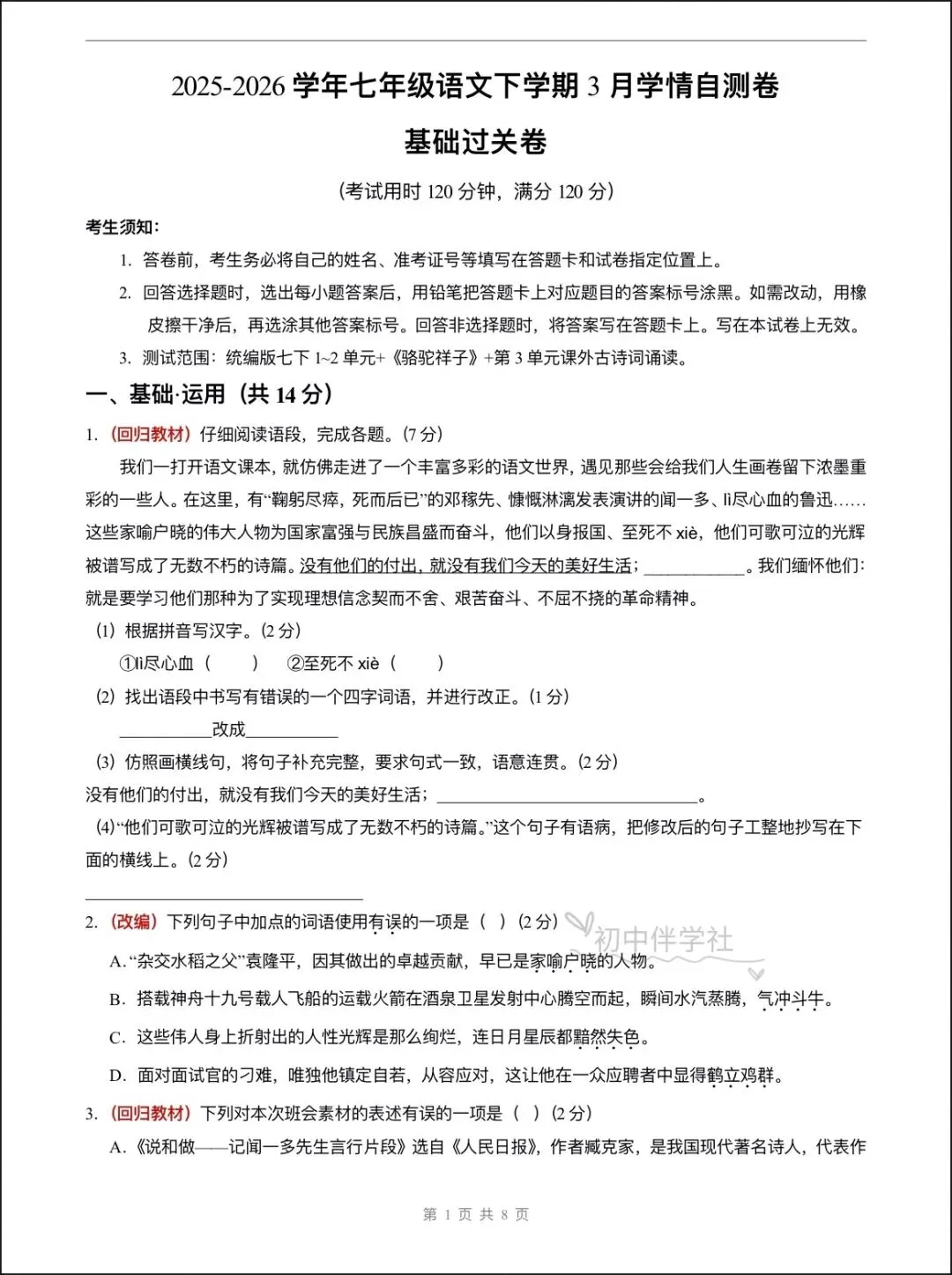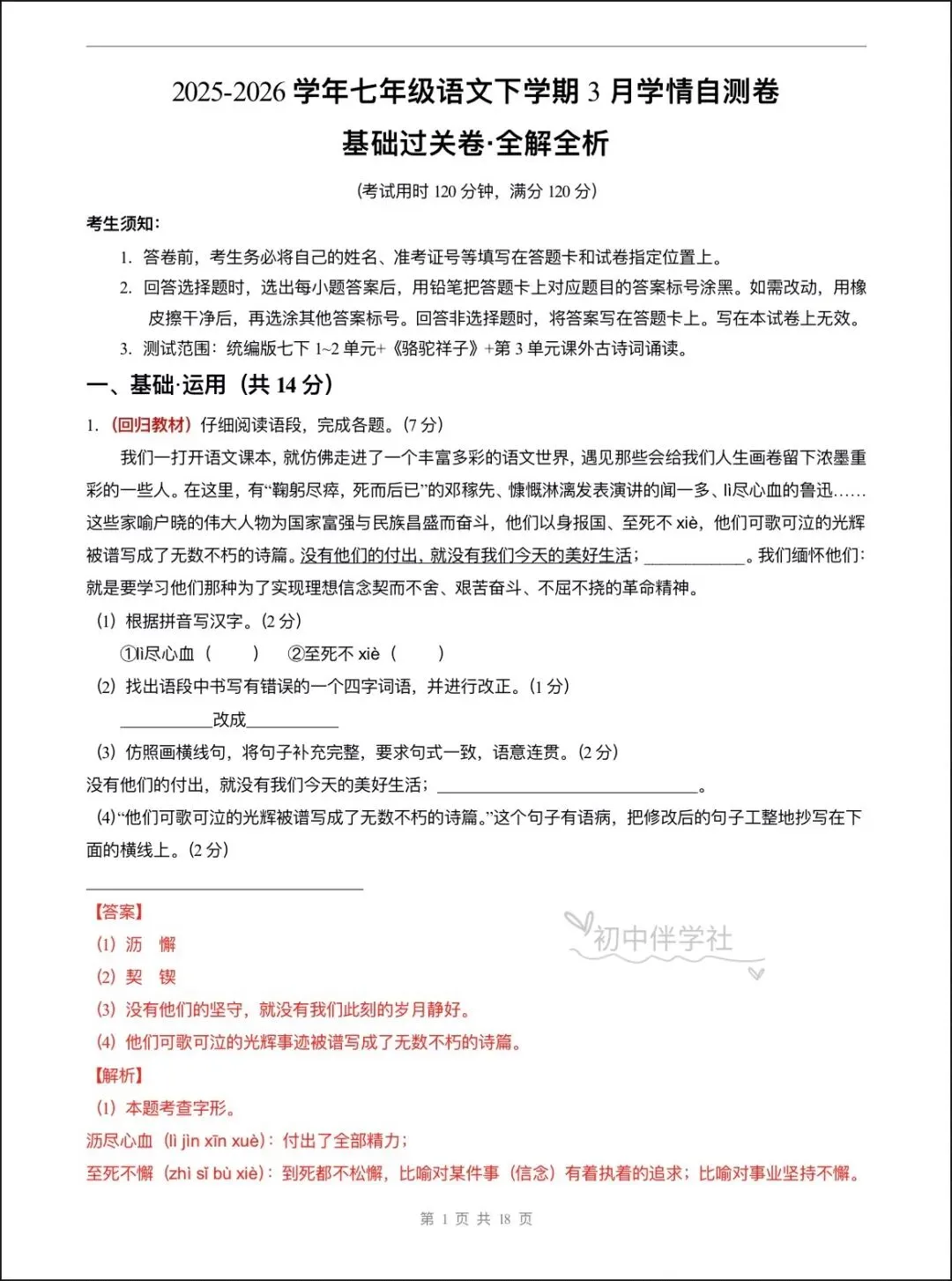 2026春七年级下册语文第一次月考试卷(基础+拔高卷),电子版可打印可下载!①:点一点右下角的“赞”和“在看”,感谢