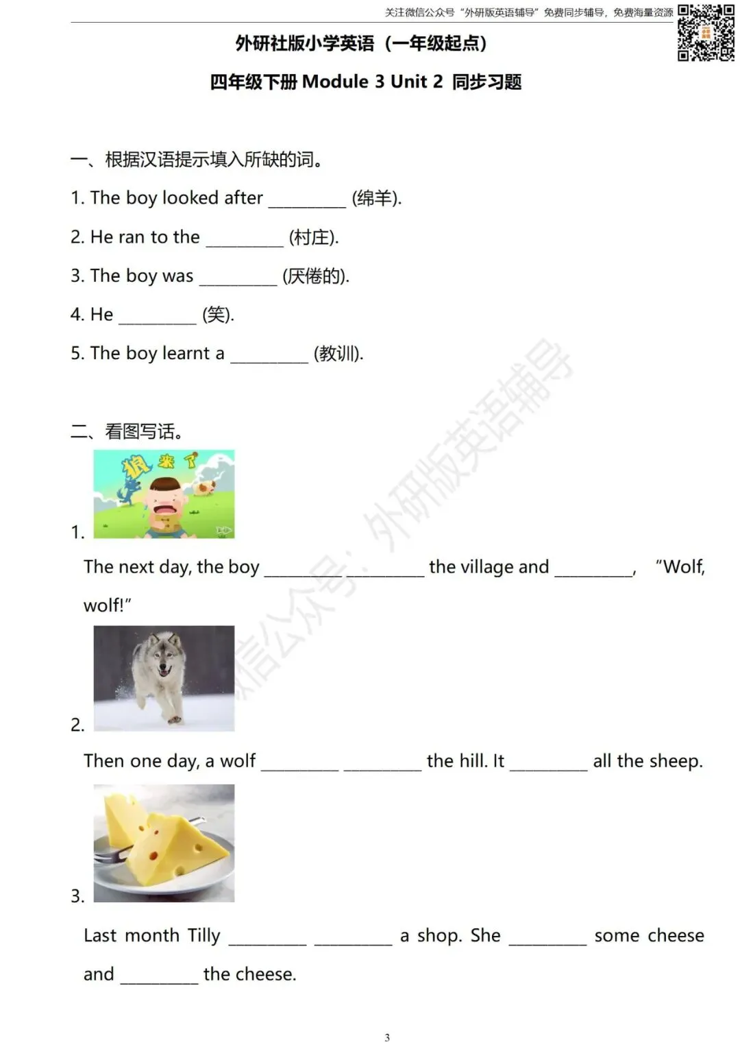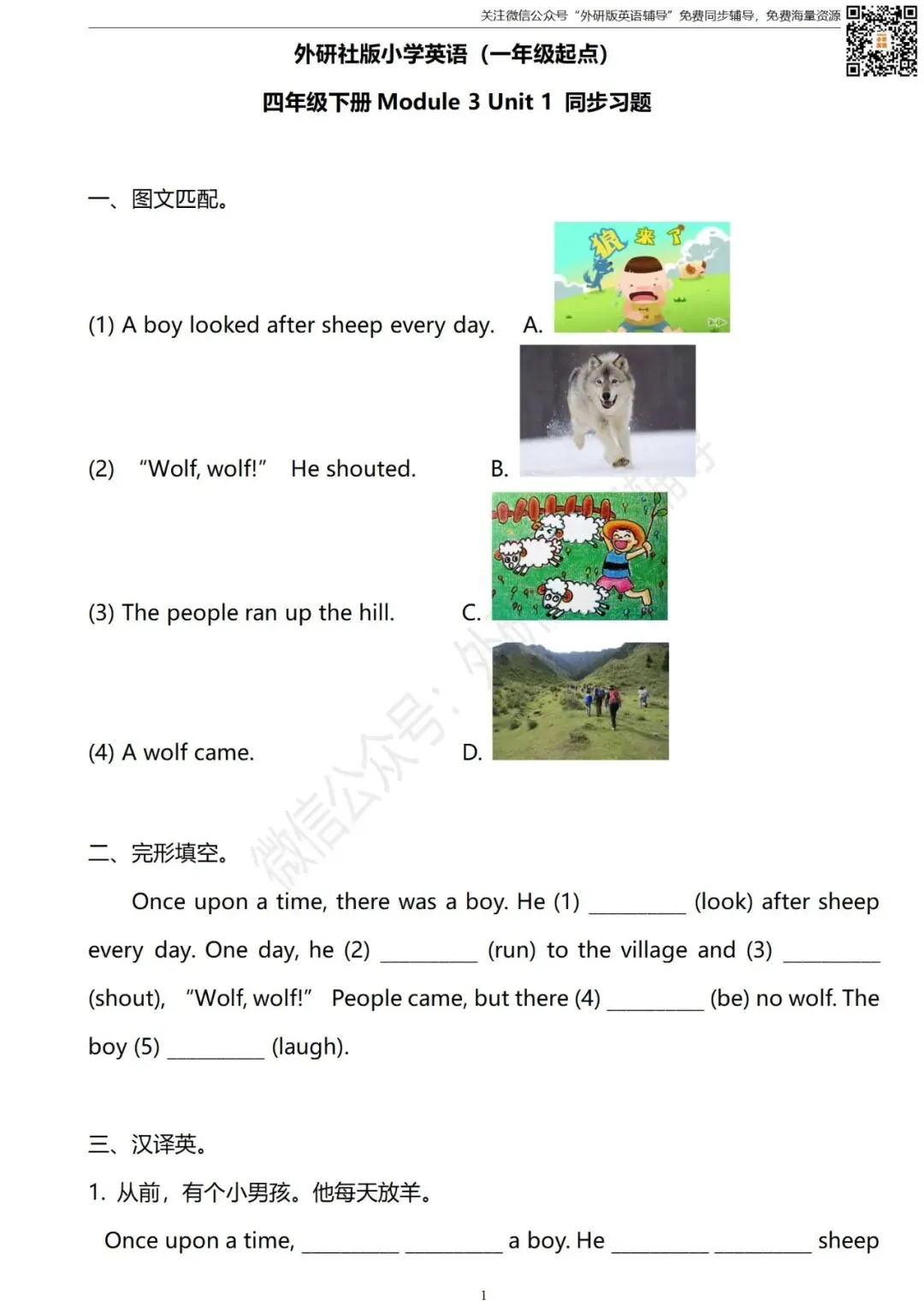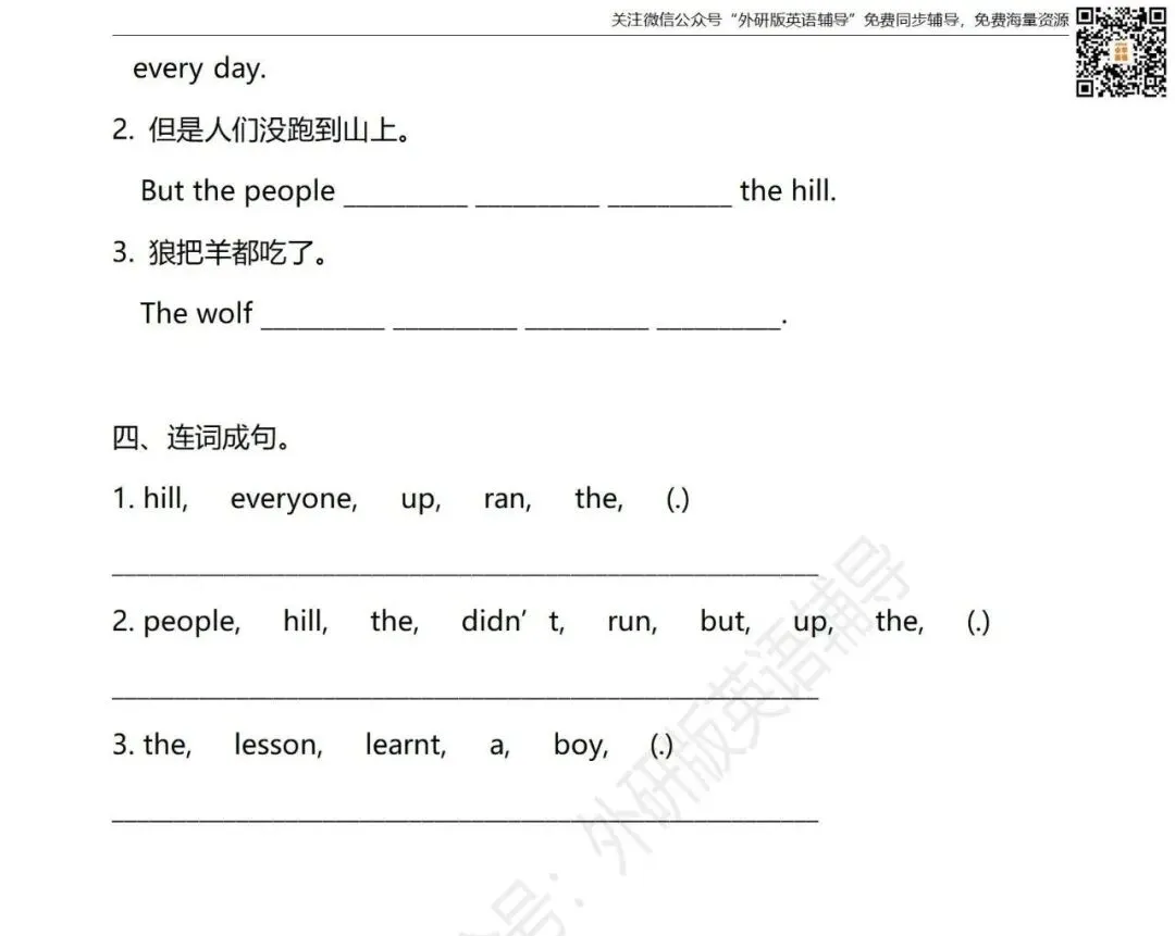 怎样获取打印版和答案?扫描下方二维码进入“外研版英语辅导”微信公众号点击公众号首页左下方键盘图标发送消息“一起点四年级试卷”即可获取打印版(不是在留言区哦)