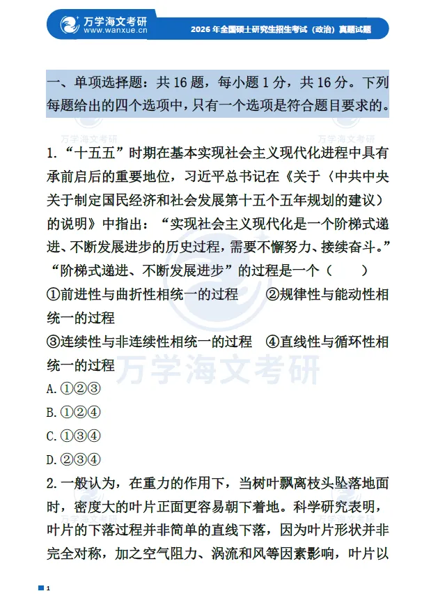2026年硕士研究生政治真题及答案解析为大家奉上