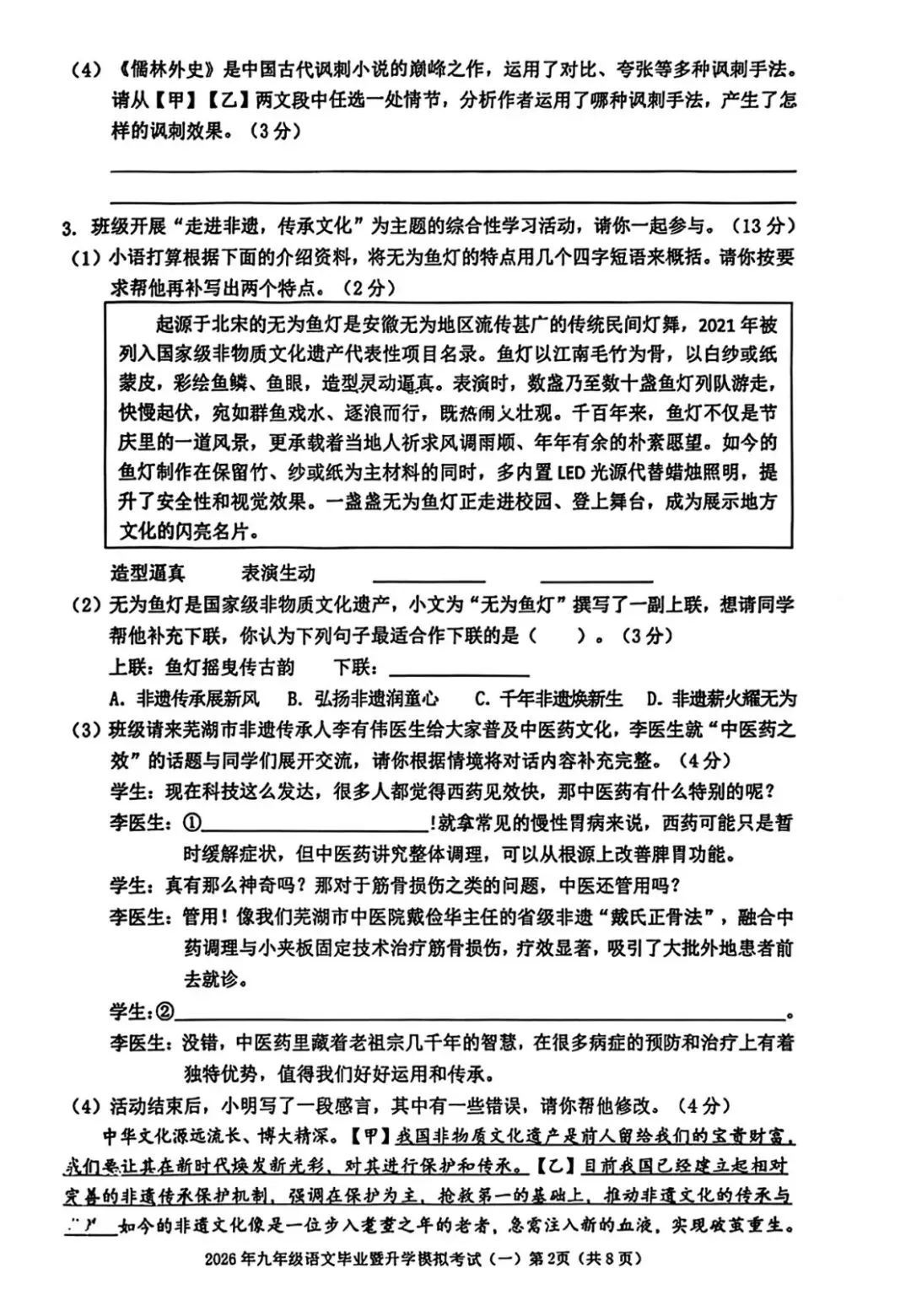 >芜湖市2026年九年级一模语文试卷