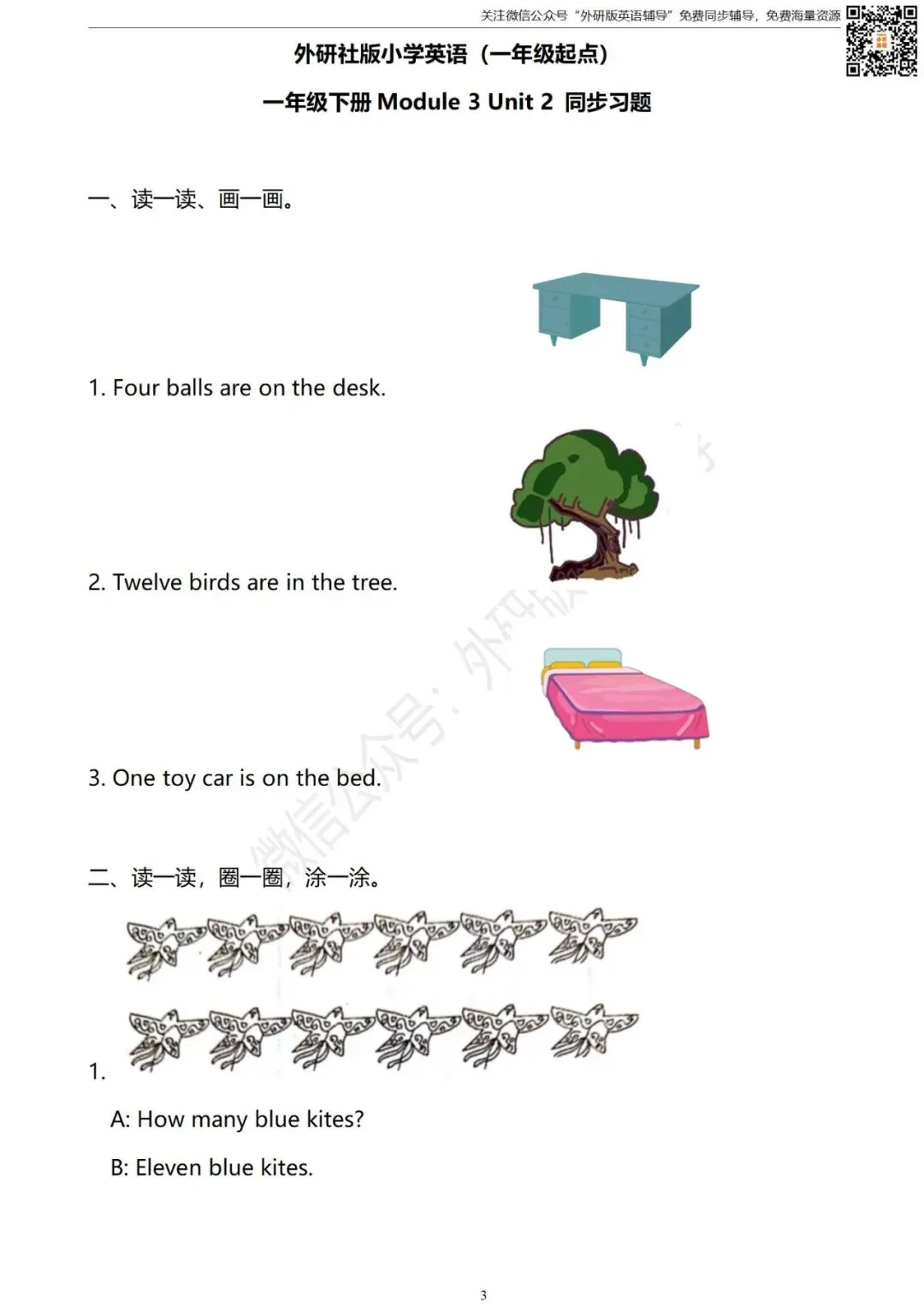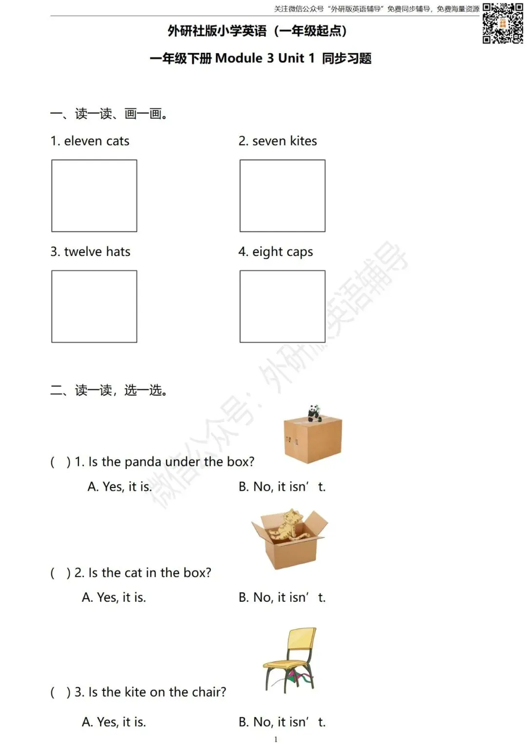 怎样获取打印版和答案?扫描下方二维码进入“外研版英语辅导”微信公众号点击公众号首页左下方键盘图标发送消息“一起点一年级试卷”即可获取打印版(不是在留言区哦)