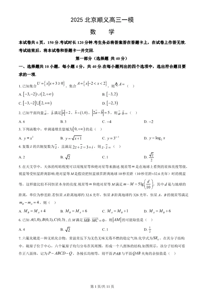>2025北京顺义高三一模数学试卷(有答案)