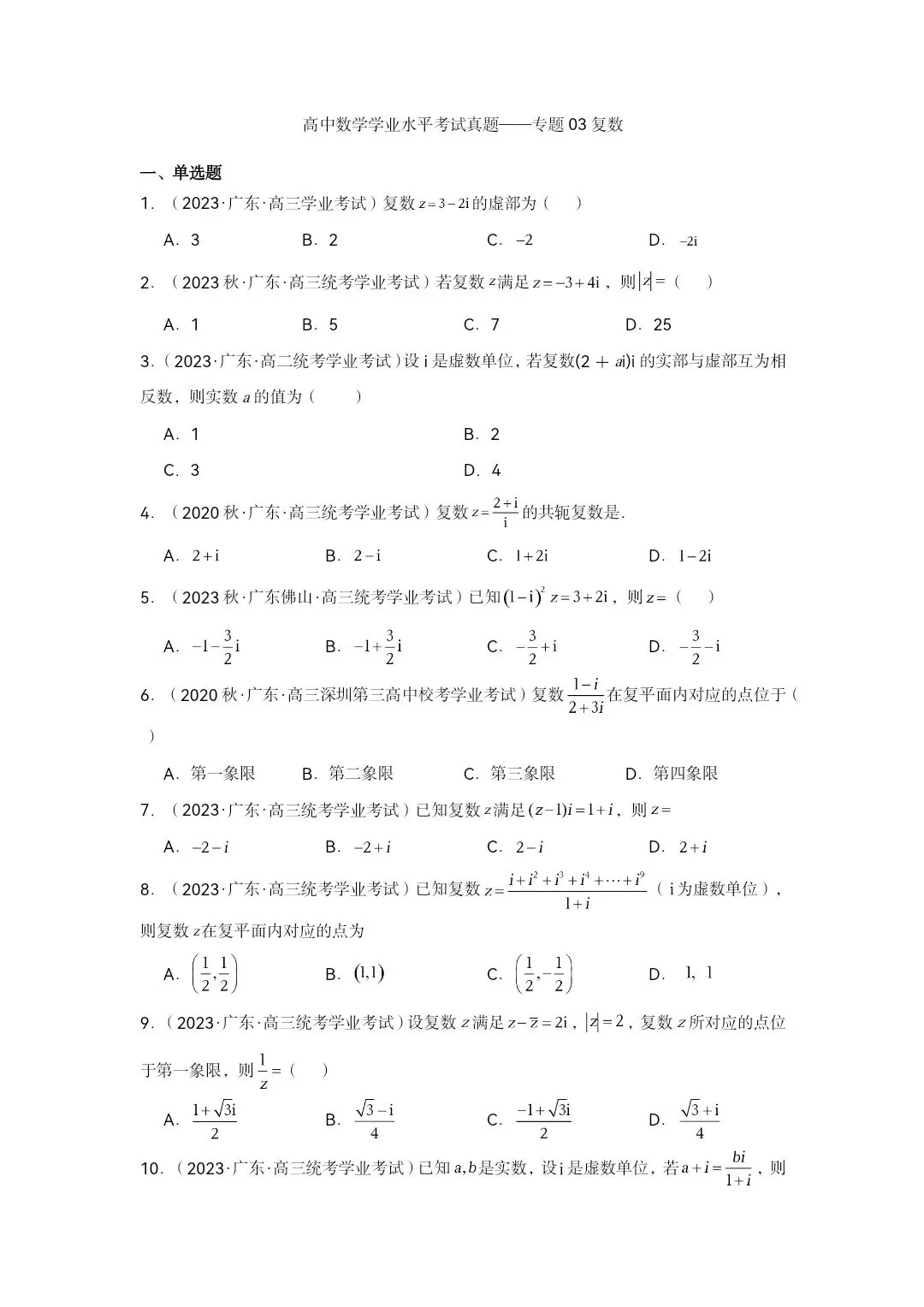 >高中数学学业水平考试真题—专题03复数