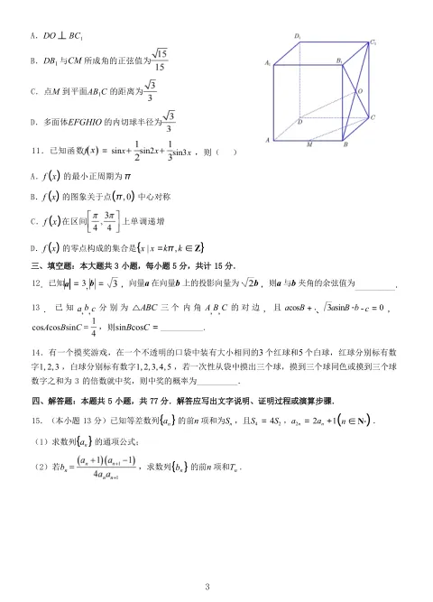 第11题:三角函数的综合性质。函数f(x)=sin x + 1/2 sin 2x + 1/3 sin 3x,判断其周期、对称性、单调性和零点。这道多选题考查了三角函数多个核心知识点,A选项需要判断最小正周期是否为π,B选项判断对称中心,C选项判断单调区间,D选项判断零点。整道题综合性很强,需要学生对三角函数图像和性质有系统的掌握。