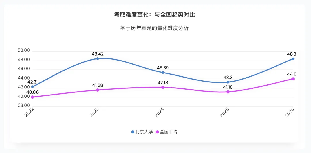 但是说实话,就现在的难度而言,北大跟复旦、南大比,还是略微有些优势的。以古代文学专业为例,26年复旦大学的难度总评得分为:44.89,南大的难度总评得分为:49.08,北大的难度总评得分为:48.39. 由于这里的计算维度中没有计算题量,所以看着北大难度好像比复旦大,但如果考虑到题量和考查科目数量,北大的综合难度还是要小于其他2所院校的。