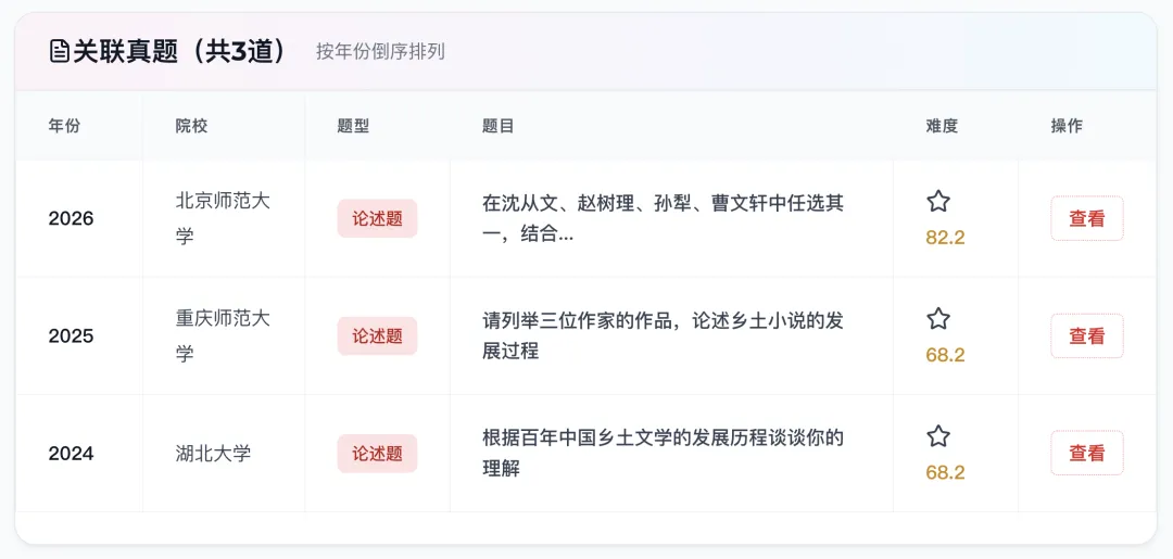 作为一个名词解释,这是送分题。但是这里我想多说一句:乡土小说是近几年真题的命题热点。从真题分析系统中能看到,从22-26年,就有7所院校考了8次“乡土小说”的名词解释。
