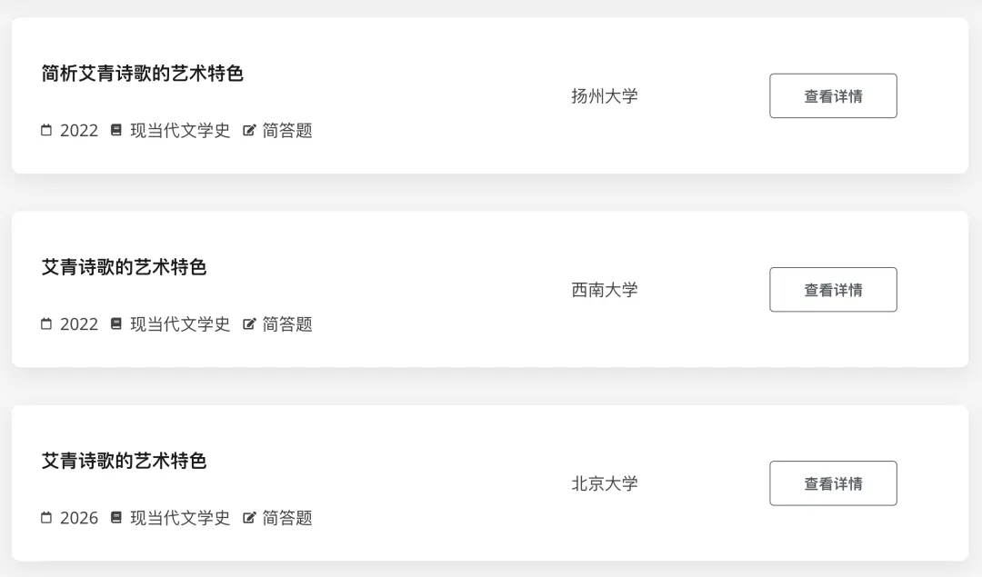 下面来到了论述题,第一题问的是“清人蒋士铨说“宋人生唐后,开辟真难为”,试论述宋人对唐诗的继承与发展。” 这题不难,是经典的考题:唐宋诗的对比。“诗分唐宋”,近5年各院校总共考了5次,其中26年还有复旦大学和四川大学考到。