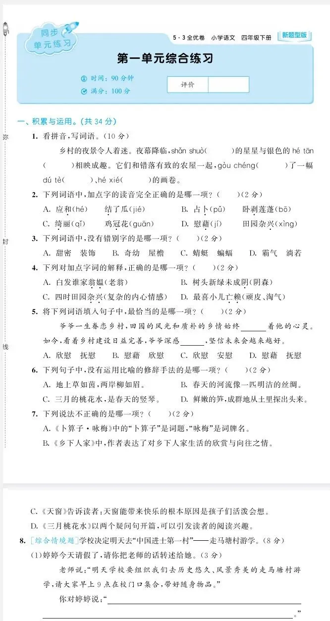 26春新版!语文《全优试卷 新题型版》1~6年级下册,第一二三单元综合练习