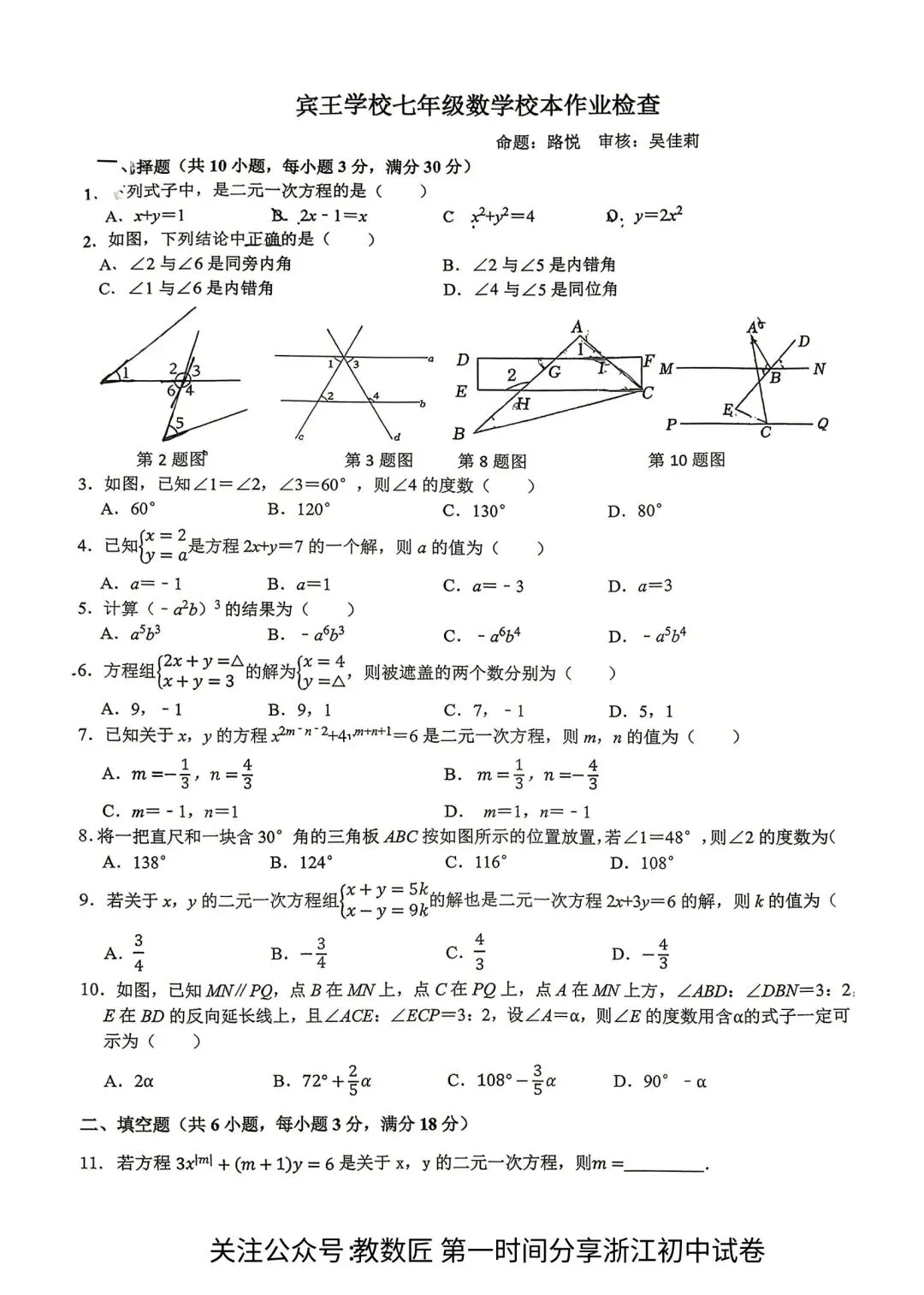 【2026浙江试卷】金华市义乌宾王中学七下月考数学试卷(2026.3)
