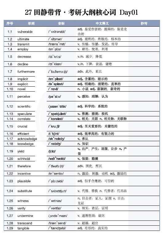 27田静《考研大纲核心词带背》笔记