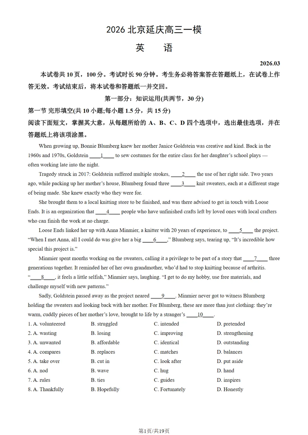 2026北京延庆高三一模英语试卷及答案