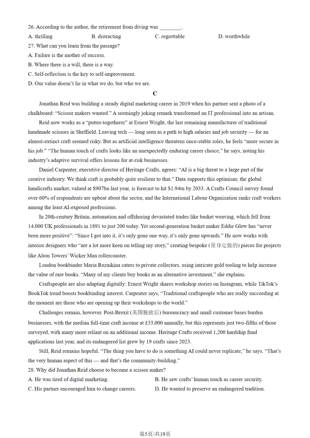 2026年南京盐城一模英语试卷和参考答案
