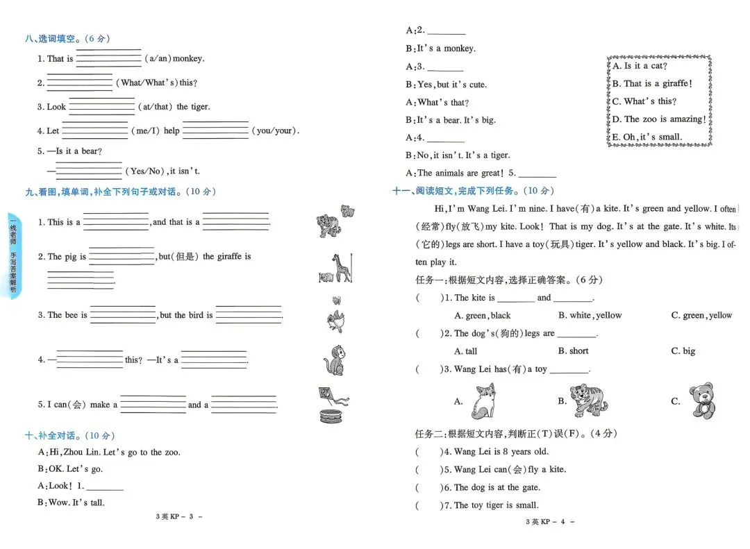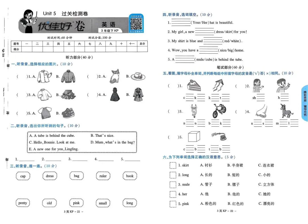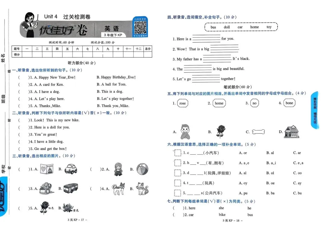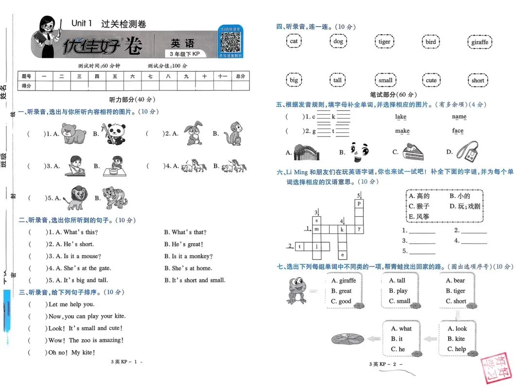 >新!科普英语三下《优佳好》试卷1-6单元精选及答案