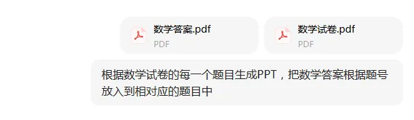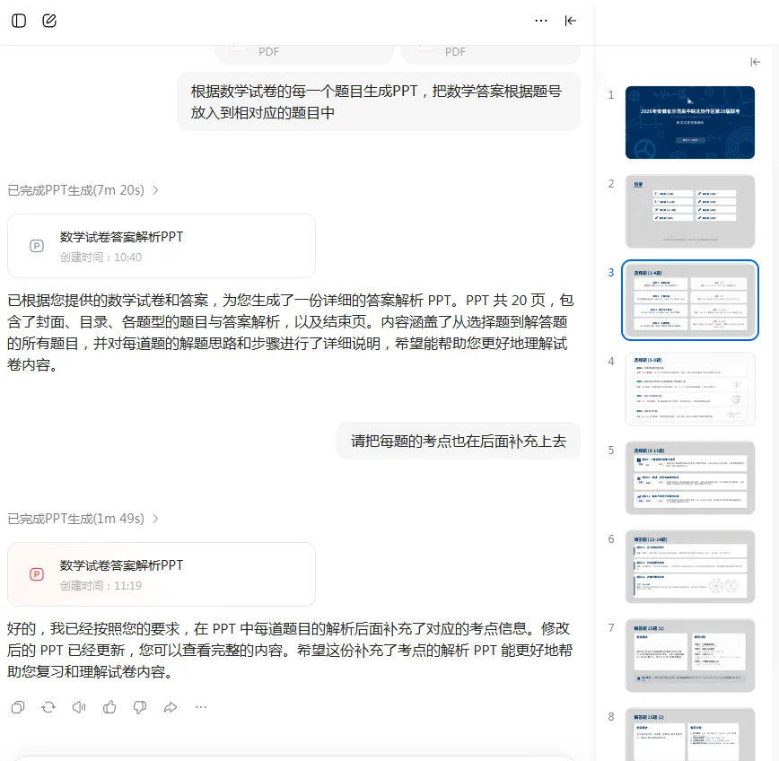 2、下发指令。我做的指令很简单先生成PPT,要求根据数学试卷的每一个题目生成PPT,把数学答案根据题号放到相对应的题目中。