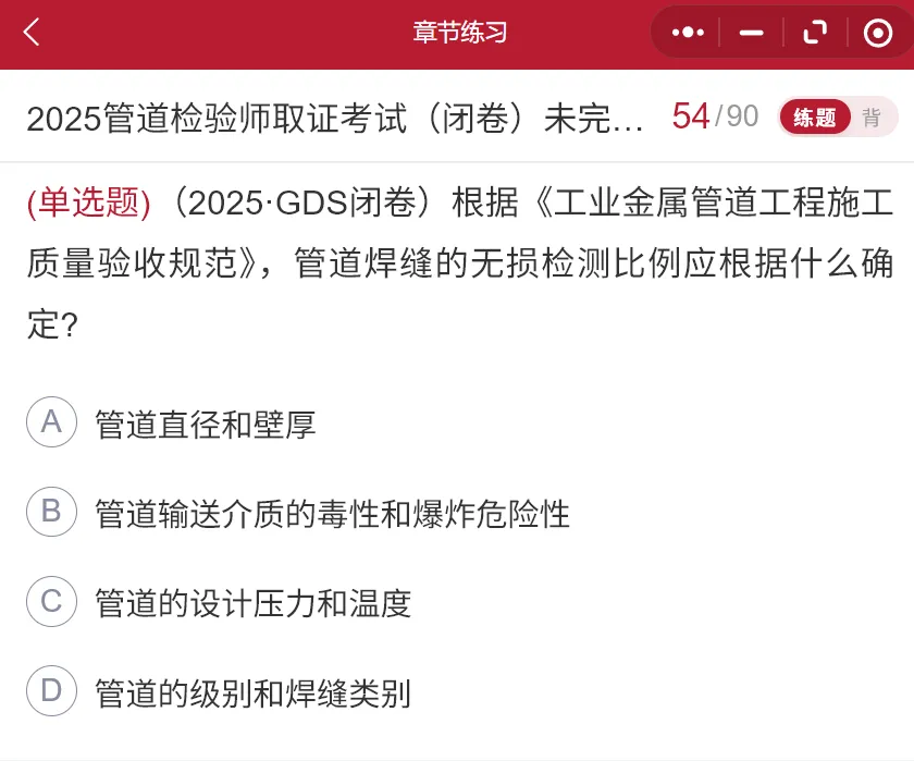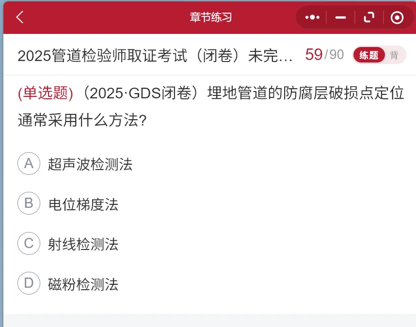 11.(2025·GDS闭卷)在管道无损检测中,下列哪种检测方法最适合检测焊缝内部的体积型缺陷(如气孔、夹渣)?