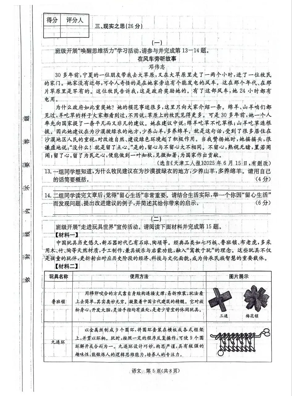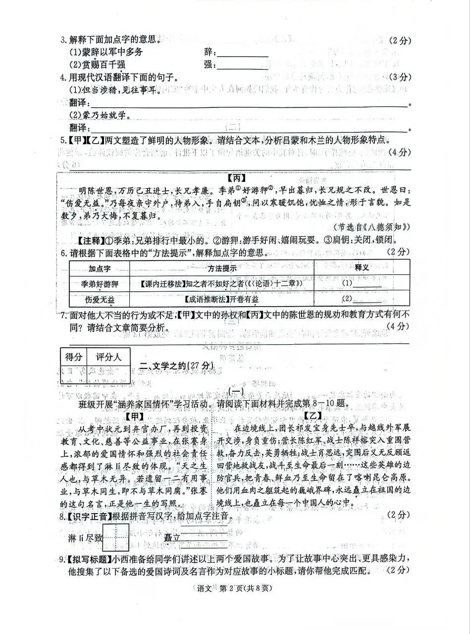 【语文试卷】山西省2025-2026学年第二学期七年级第一次阶段训练试卷