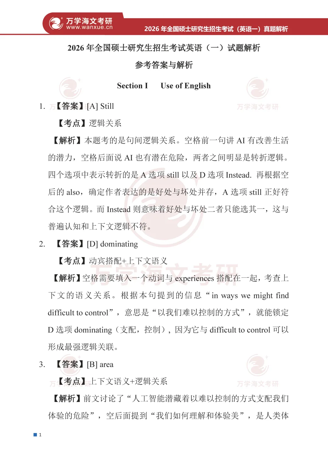 2026年硕士研究生英语一初试真题及答案解析为大家奉上