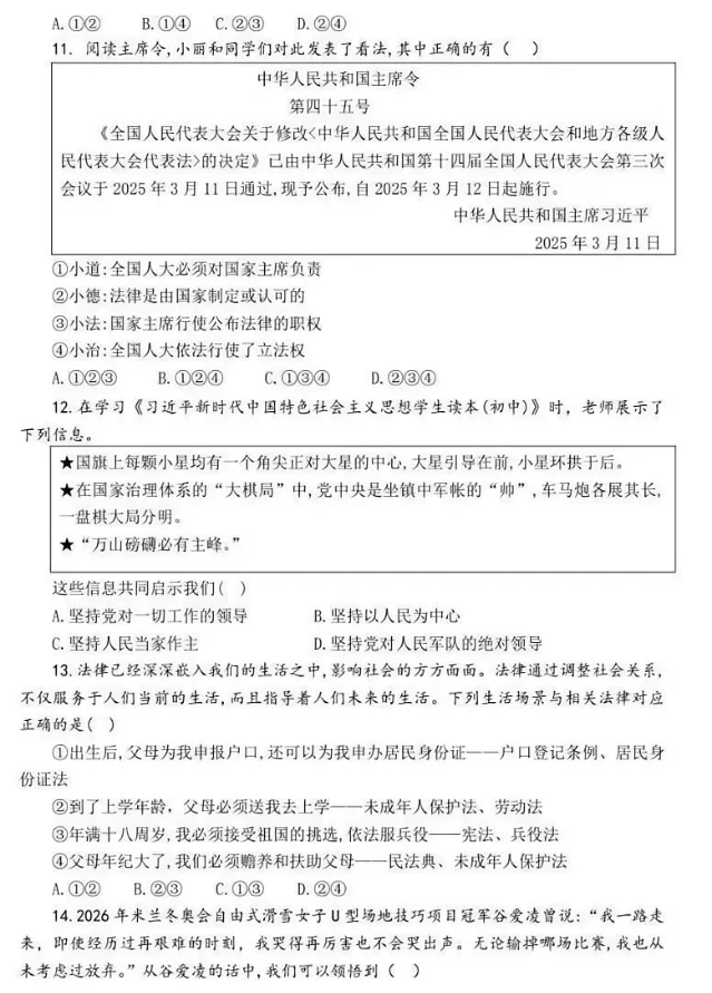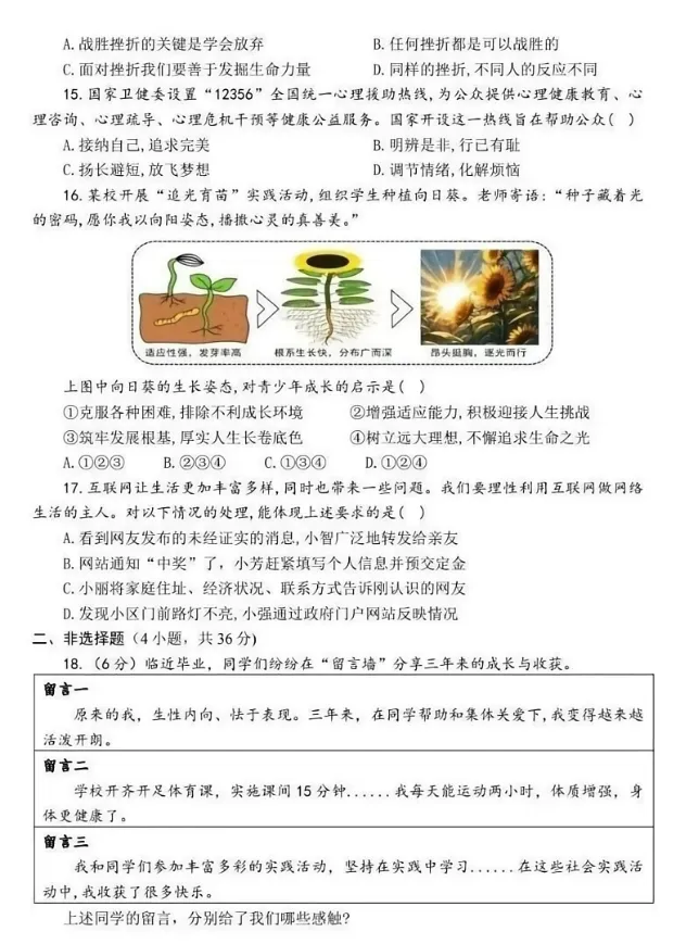 18.留言一:集体的力量是强大的,在某种程度上可以影响甚至改变一个人;我们要积极参加集体生活,不断完善自我。(亦可从集体生活、美好集体等方面作答,或友谊让我们更深刻地体悟生命的美好。)
