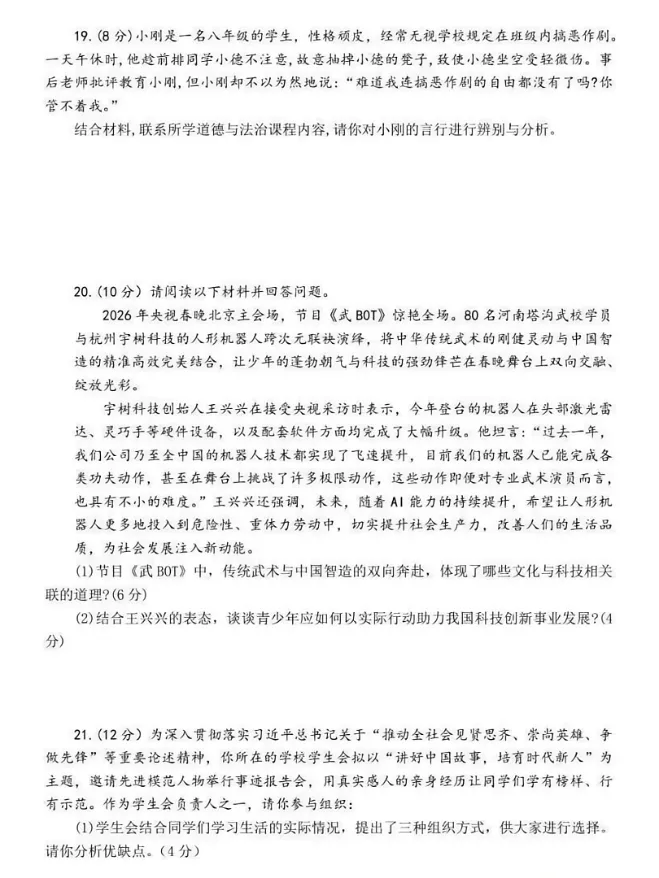 20.(1)①中华文化源远流长、博大精深,传统武术作为中华优秀传统文化的重要组成部分,需要我们传承和创新;②科技创新赋能中华优秀传统文化,为优秀传统文化的传承注入新活力;③科技创新推动中华优秀传统文化创造性转化、创新性发展;④我国坚持科技与文化深度融合,既彰显了中国智造的实力,也增强了中华文化的影响力和感染力。