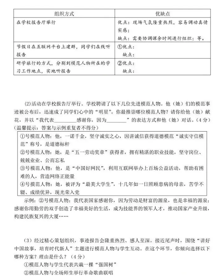 评分说明:第一问每种组织方式的优点、缺点各1分,最高给4分。第二问推荐方框内的任一模范人物均可,对话内容可以从模范人物精神品质的重要性及模范人物做法产生的社会价值等两个方面陈述,一个方面得2分,两个方面得4分。第三问理由答出任意一个方面即可给2分,最高给分,只选择方案,无分析理由不得分。其他答案合理者,亦可酌情给分。