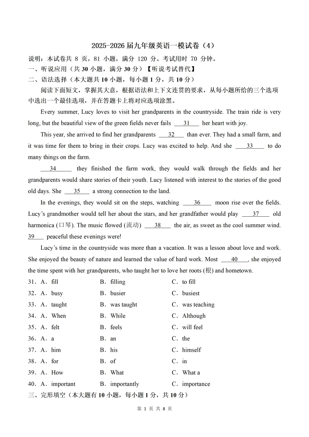 >2025-2026届九年级中考英语一模试卷(含答案),题型全面,命中率高!