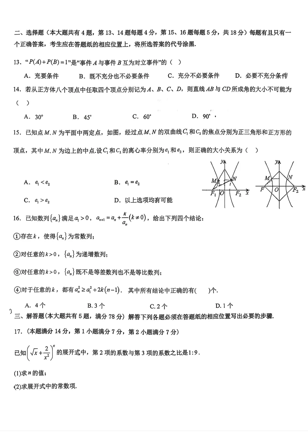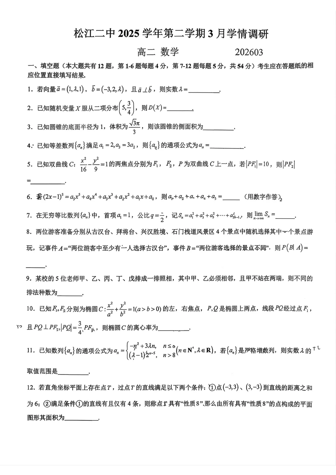 >上海市松江二中高二数学月考试卷(2026.3)