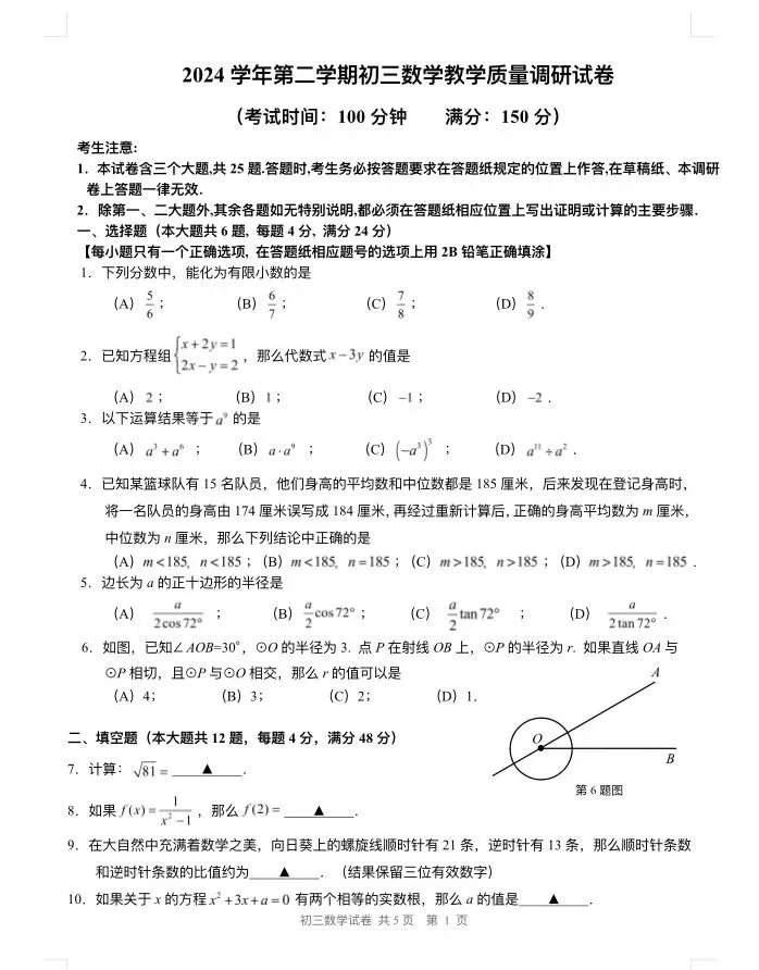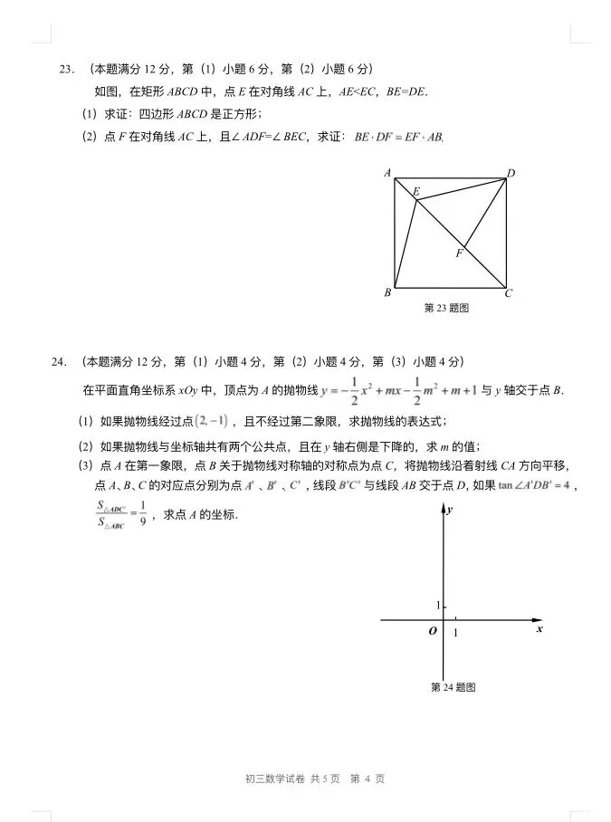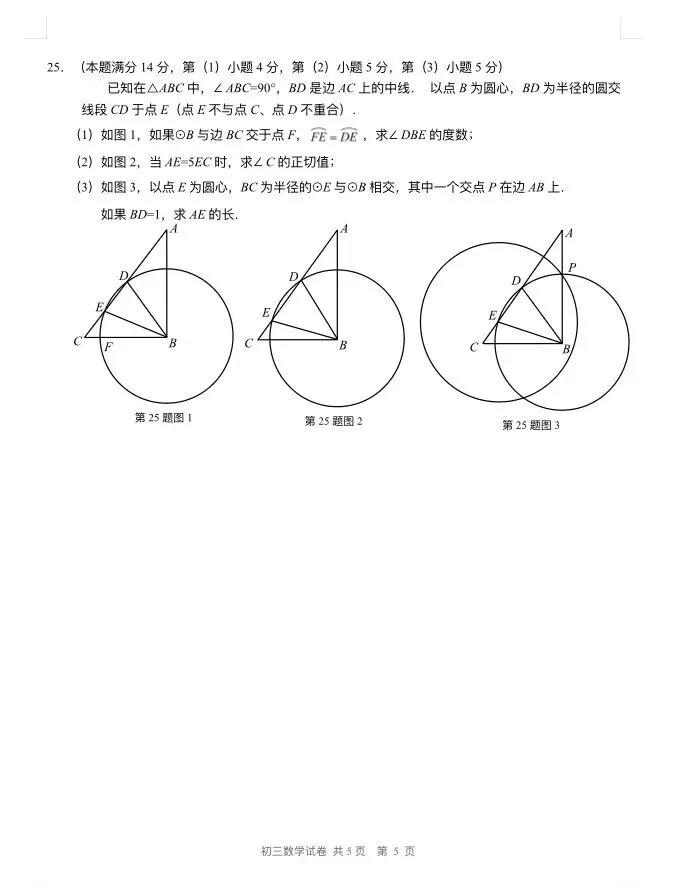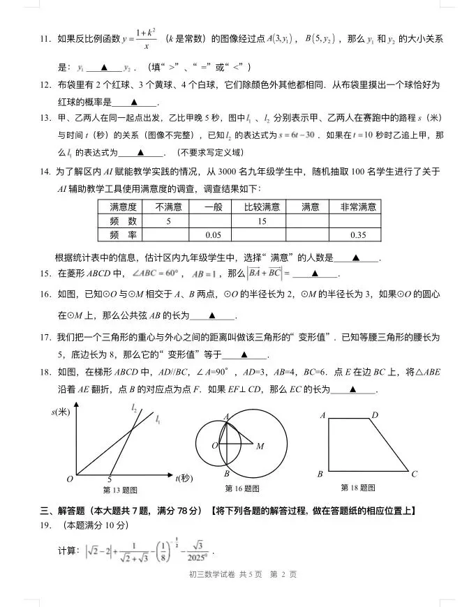 >2025年长宁初三二模数学试卷及参考答案