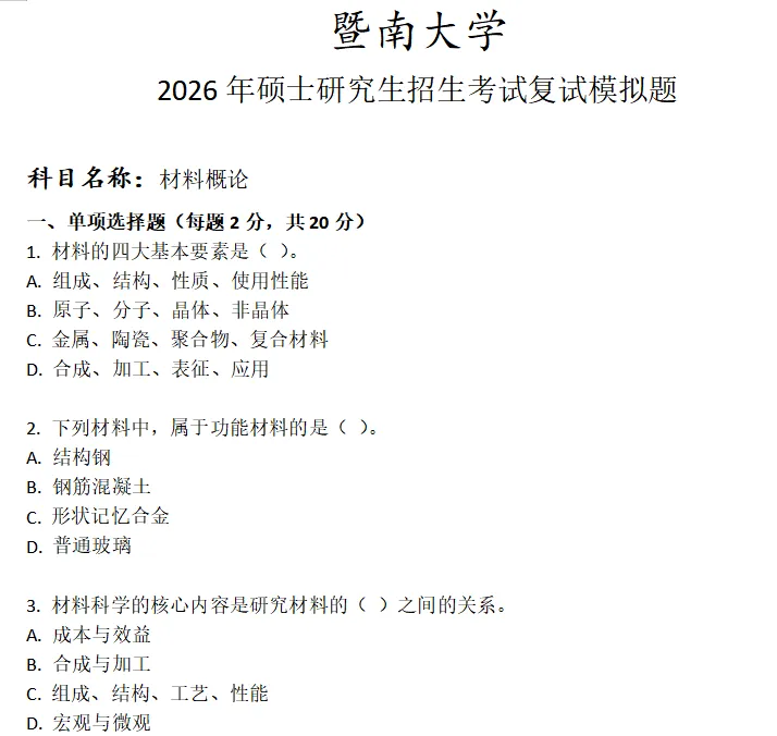当前位置:首页>考研真题>暨南大学材料概论考研复试真题模拟