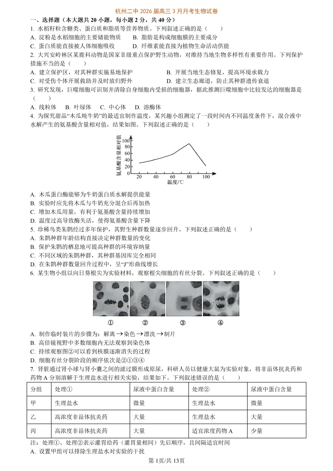 【试卷分享】杭州二中高三下学期3月月考(生物·含答案与解析)