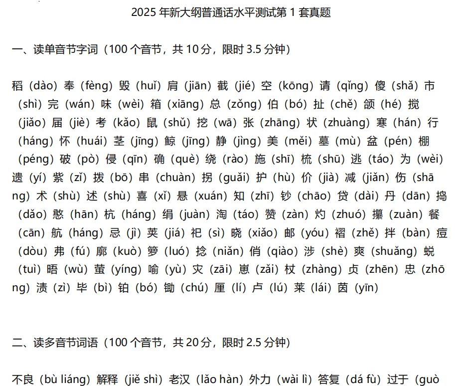 一、读单音节字词(100 个音节,共 10 分,限时 3.5 分钟)