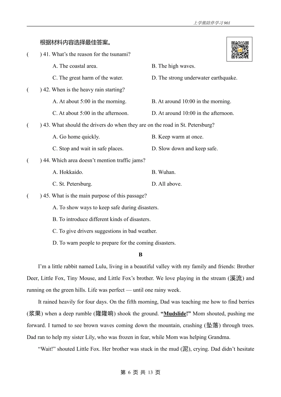 45. D通读全文可知,三个文段都在提醒人们为即将到来的灾害做准备。