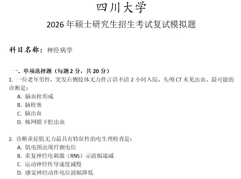 >四川大学神经病学考研复试真题模拟