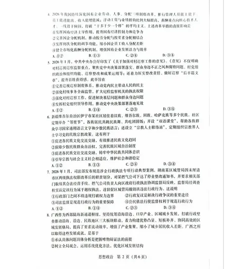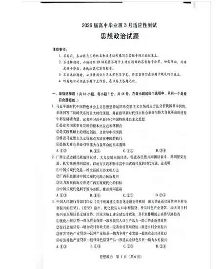 广西2026届高中毕业班3月适应性测试试卷及答案(梧州、玉林、贵港、钦州、百色等市)