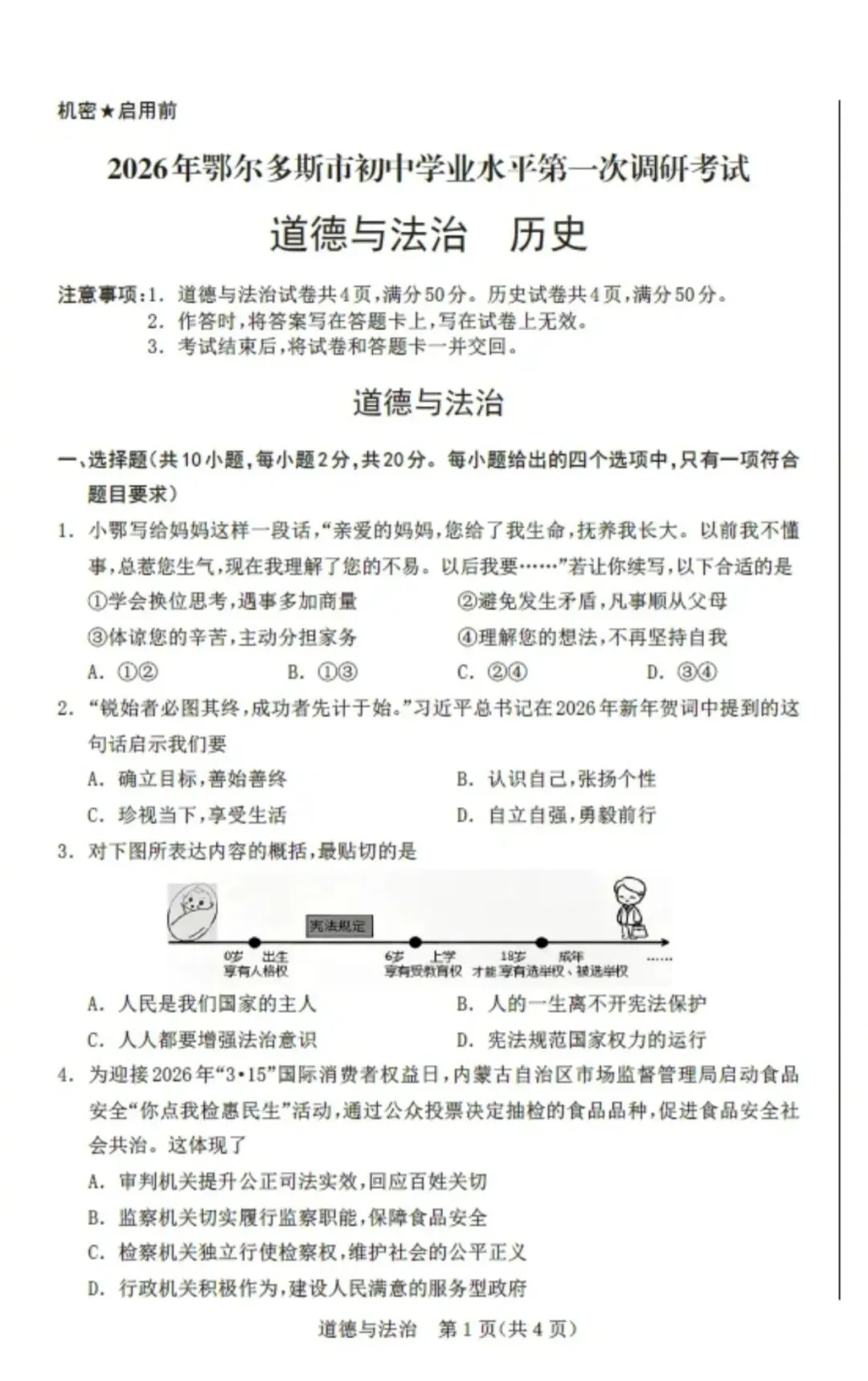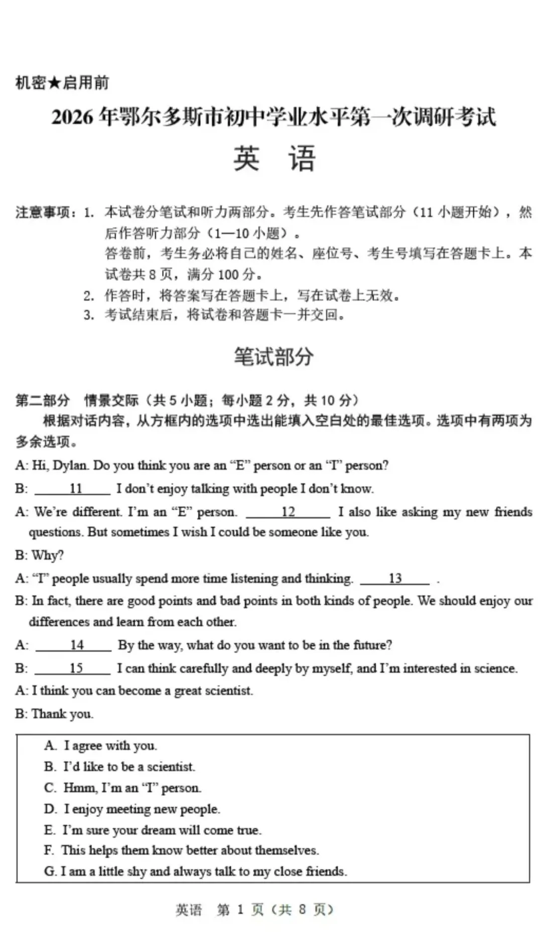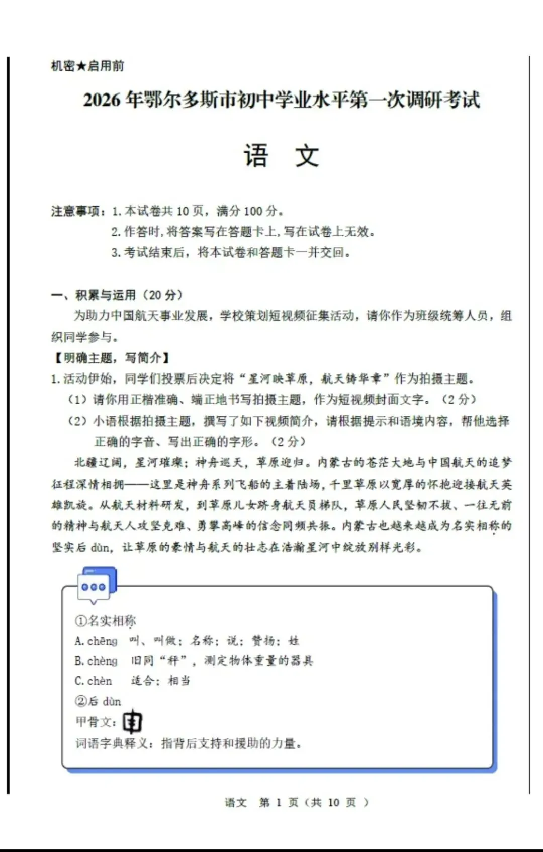 >2026年中考鄂尔多斯市一模全科试卷