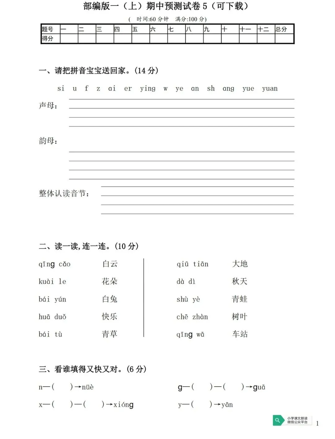 2019部编版一(上):月考测试卷1(可下载)